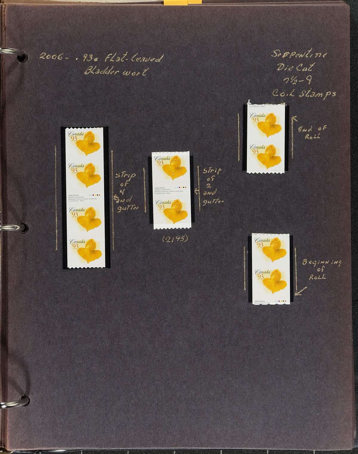 In-depth collection of primarily mint never hinged "Flower" and "First Class" definitives, 2006, covering Unitrade #s 2187-2200, all in hingeless mounts in over 50 well described pages, housed in a binder. The collection contains mint and used singles (including booklet stamps), booklets, mint and used souvenir sheets, coil singles, pairs, and strips of 4, along with roughly 30 first day covers (appearing to have Lower Mainland B.C. postmarks from a variety of outlets). We note some better items cataloguing $15.00 and up, including #2187 coil uncut press panel of 100 (c.v. $170.00). Face value alone totals $283.00 (includes 171x "P" stamps). A nice comprehensive collection that would be difficult to duplicate. 2024 Unitrade =