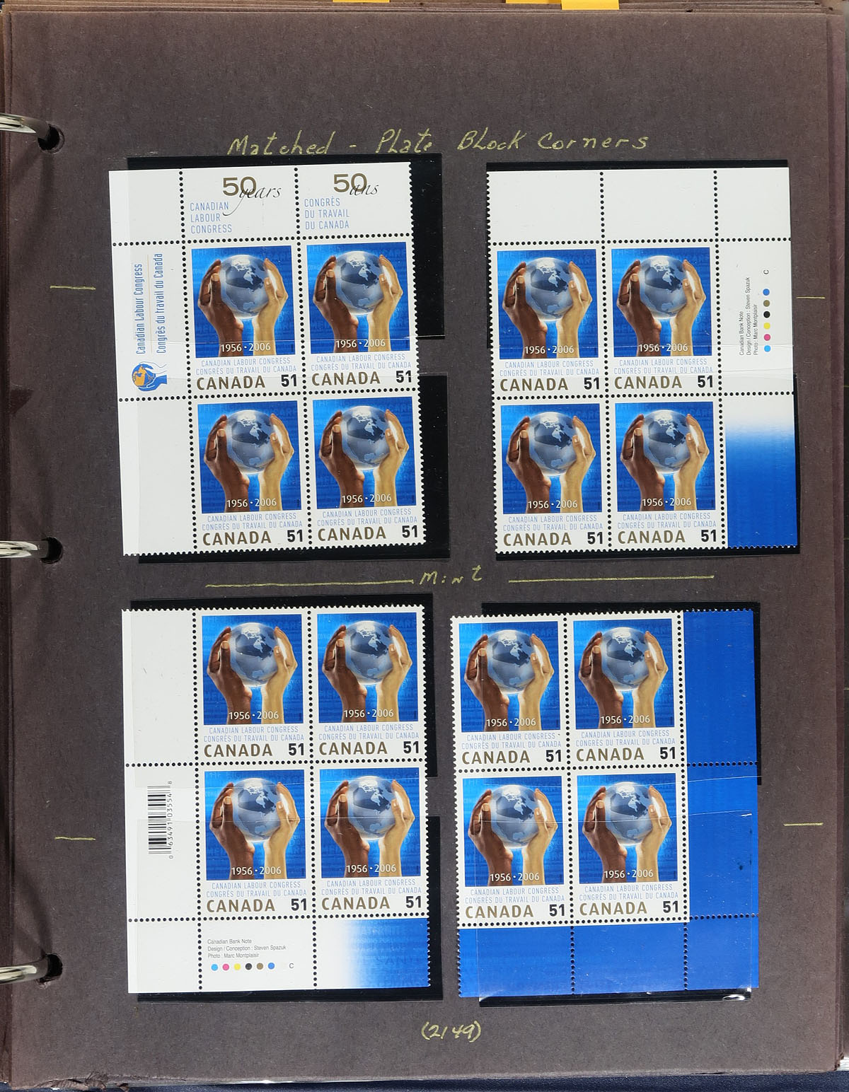 In-depth collection of primarily mint never hinged Canada, from January to May of 2006, covering Unitrade #s 2140-2156, all in hingeless mounts in over 50 well described pages, housed in a thick binder. The collection contains mint and used singles (including booklet stamps), multiples, matched set of plate blocks (including used sets), for some issues, along with a few souvenir sheets and sheetlets (mint and used), booklets (including used booklet panes), and first day covers. We note several match sets cataloguing $10.00 and up. Face value alone totals $174.00. A nice comprehensive collection that would be difficult to duplicate. 2024 Unitrade =