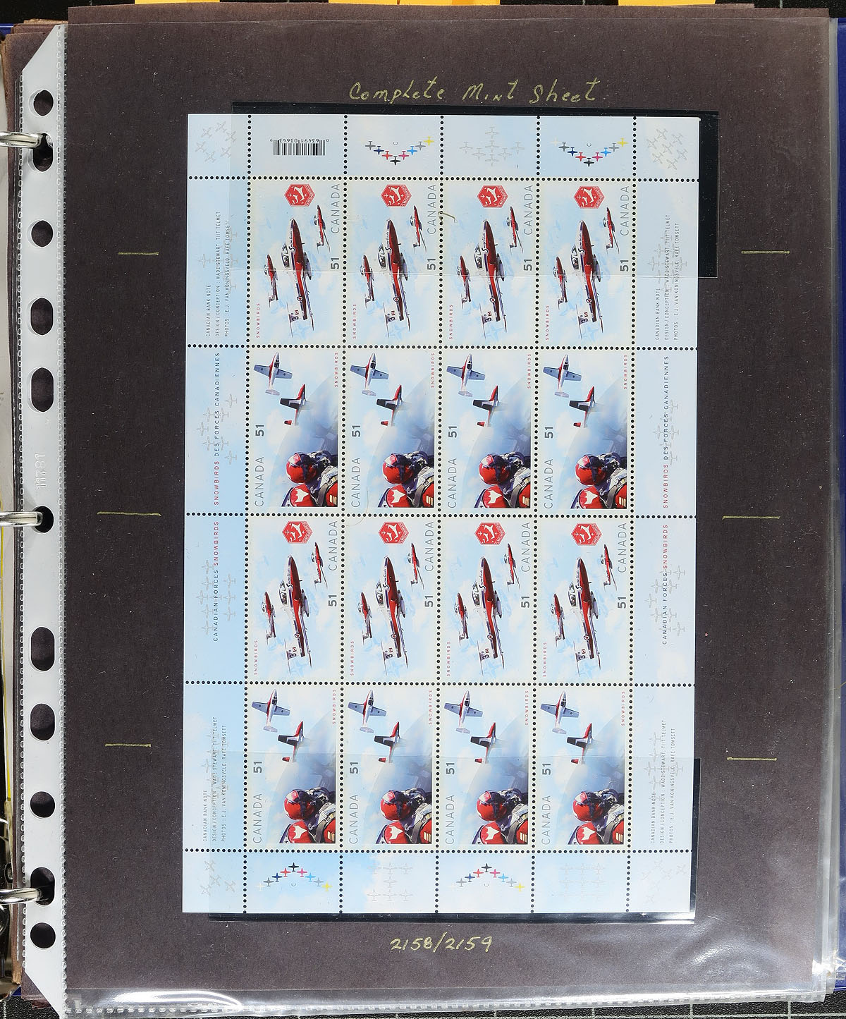 In-depth collection of primarily mint never hinged Canada, from June to November of 2006, covering Unitrade #s 2157-2186, all in hingeless mounts in over 50 well described pages, housed in a thick binder. The collection contains mint and used singles (including booklet stamps), multiples, matched set of plate blocks (including used sets), for some issues, along with a few souvenir sheets and sheetlets (mint and used), booklets (including used booklet panes), and first day covers. We note several match sets cataloguing $10.00 and up. Face value alone totals $176.00. A nice comprehensive collection that would be difficult to duplicate. 2024 Untrade =