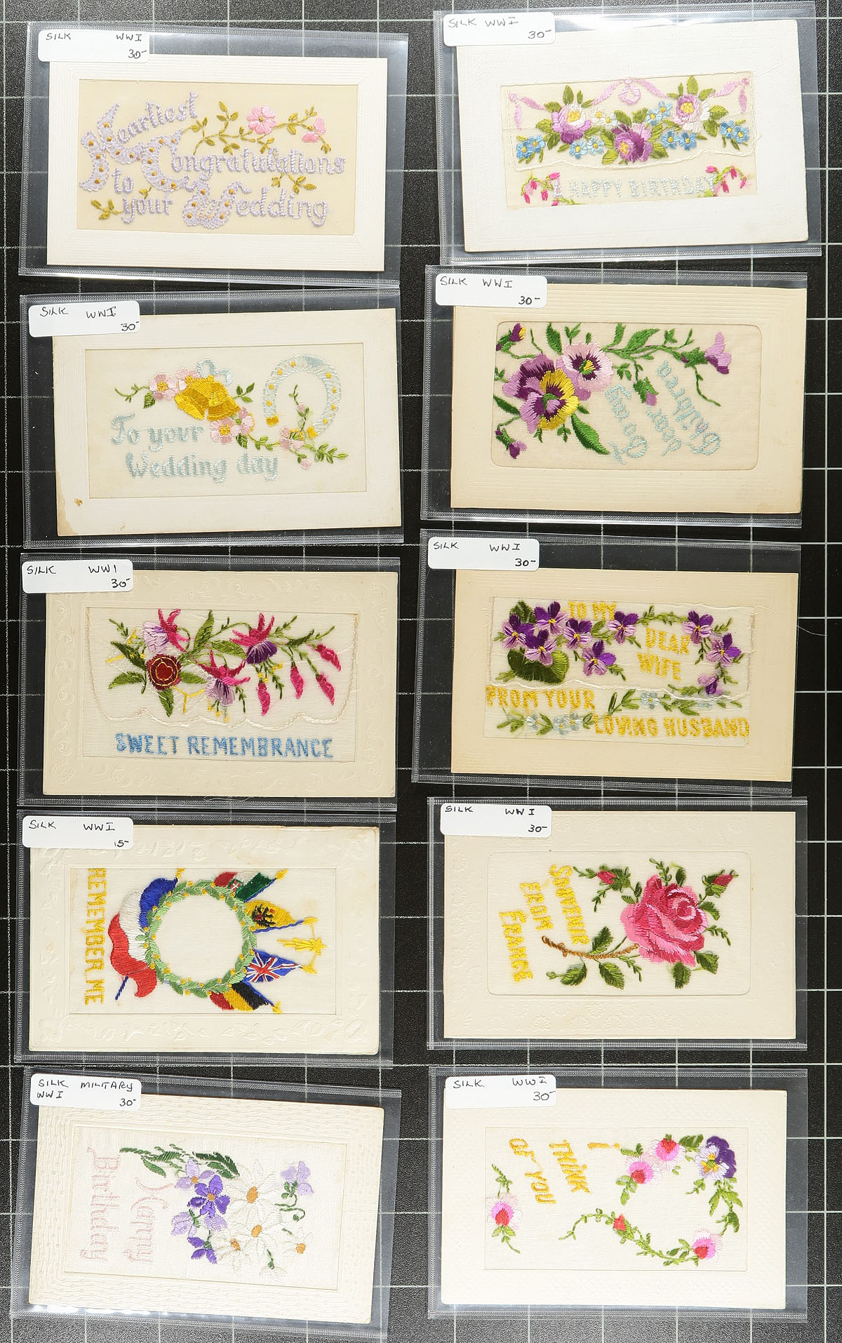 Accumulation of 36 "Silk" greeting postcards. These silk embroidered postcards which were a premium postcard item at the time were very popular during the WWI period, especially with soldiers serving in France to send back home (often within an envelope to protect them) to their sweetheart or family member. A very clean offering of these desirable postcard, all in the original sleeves from when purchased by the collector, most priced $20.00-$30.00 each. Estimate =