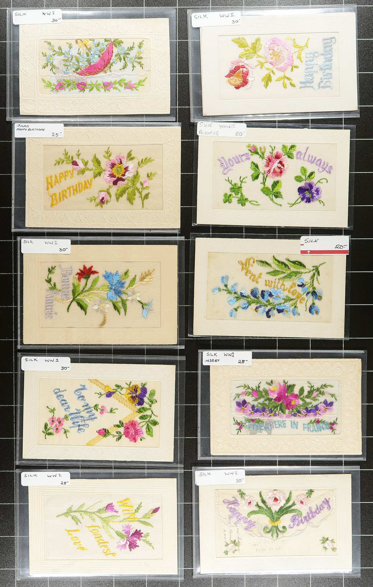 Accumulation of 36 "Silk" greeting postcards. These silk embroidered postcards which were a premium postcard item at the time were very popular during the WWI period, especially with soldiers serving in France to send back home (often within an envelope to protect them) to their sweetheart or family member. A very clean offering of these desirable postcard, all in the original sleeves from when purchased by the collector, most priced $20.00-$30.00 each. Estimate =