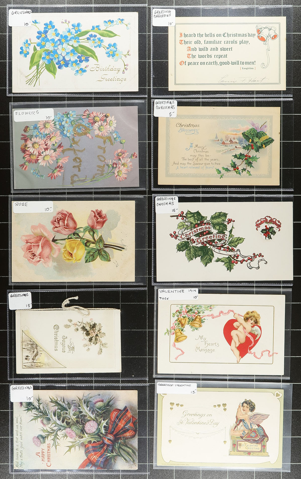 Vintage Greeting Postcards. A visually attractive offering of 37 postcards, with a "Greetings" theme including Birthdays, Valentines, St Patrick's Day, Easter, Christmas and New Years. All are vintage pre-1920 postcard, with a good mix of both used and unused. Each is individually sleeved and priced from when the original owner purchased them, with prices ranging from $5.00 to $25.00 each. Estimate =