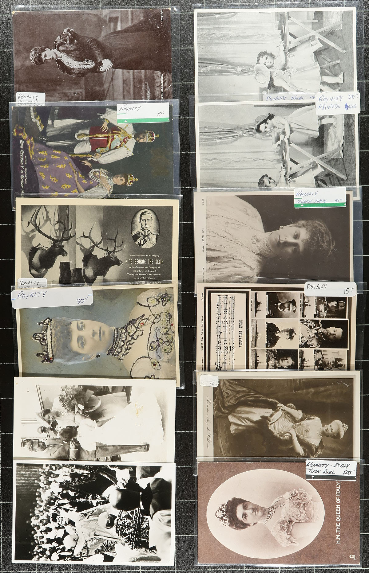 British Royal Family Topical. A collector's accumulation of 55 postcards, all featuring the Royal Family, or relating to such. Includes a good variety of early (ca1910) postcards, but also noted some attractive postcards relating to the 1939 Royal Visit to Canada. Condition is well above average, with many of the cards still in the original sleeves from when originally purchased. Estimate =