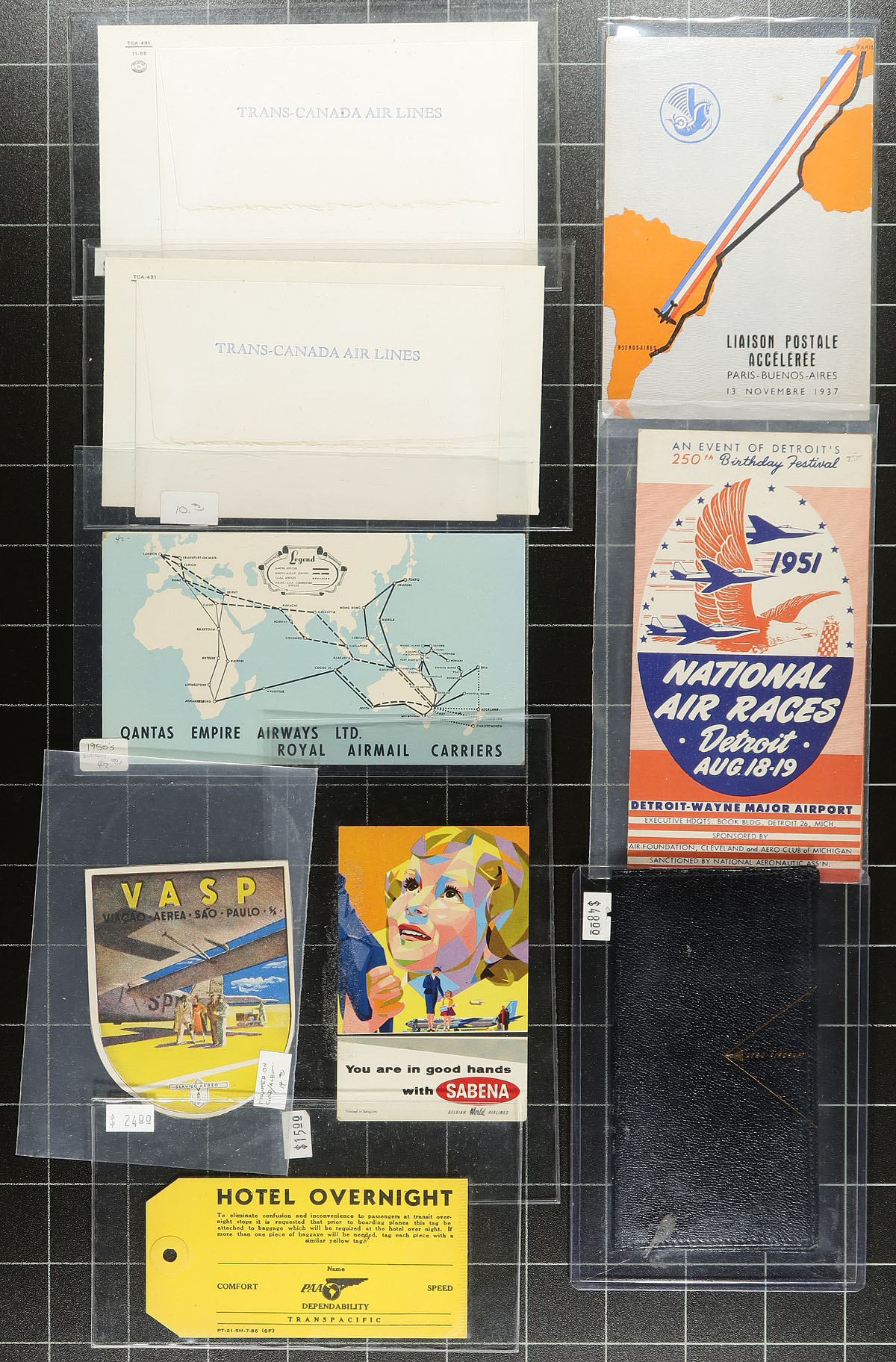 Airlines / Airmail / Airplanes, a collectable aeronautical journey! A diverse offering of 74 items relating to airplanes, as accumulated by a local collector. Includes early photographs, luggage tags, luggage labels, tickets, advertising etc. A few of the more notable items include a 1928 Italian Aeronautical Exposition postcard, France 1946 Paris National Aeronautic Salon postmark covers (x3) and a 1920 photograph of an airplane crash "Accident Paquelin, Istres, aout 1920" (August 1920, Istres, France). Some items still in the original sleeves from when originally purchased (with prices up to $65.00). Estimate =