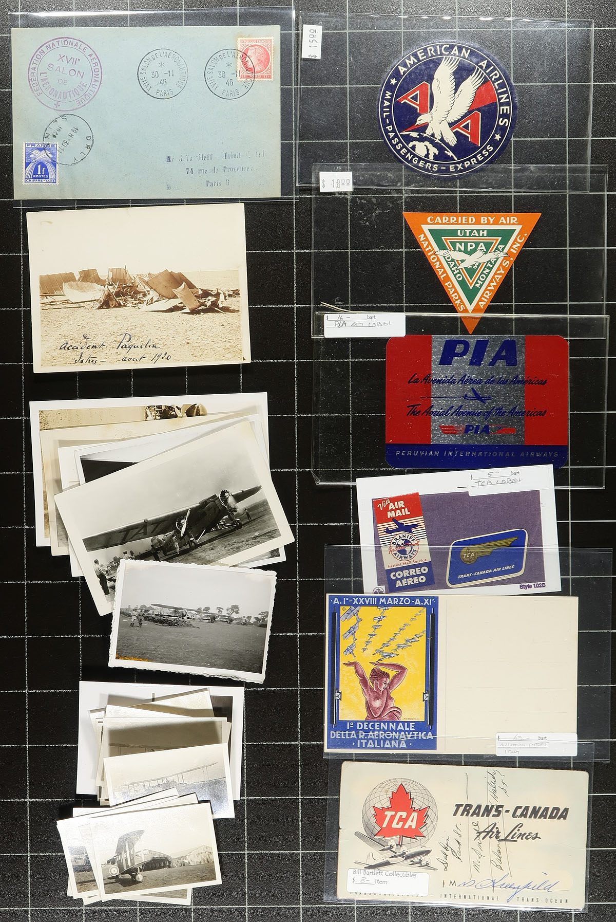 Airlines / Airmail / Airplanes, a collectable aeronautical journey! A diverse offering of 74 items relating to airplanes, as accumulated by a local collector. Includes early photographs, luggage tags, luggage labels, tickets, advertising etc. A few of the more notable items include a 1928 Italian Aeronautical Exposition postcard, France 1946 Paris National Aeronautic Salon postmark covers (x3) and a 1920 photograph of an airplane crash "Accident Paquelin, Istres, aout 1920" (August 1920, Istres, France). Some items still in the original sleeves from when originally purchased (with prices up to $65.00). Estimate =