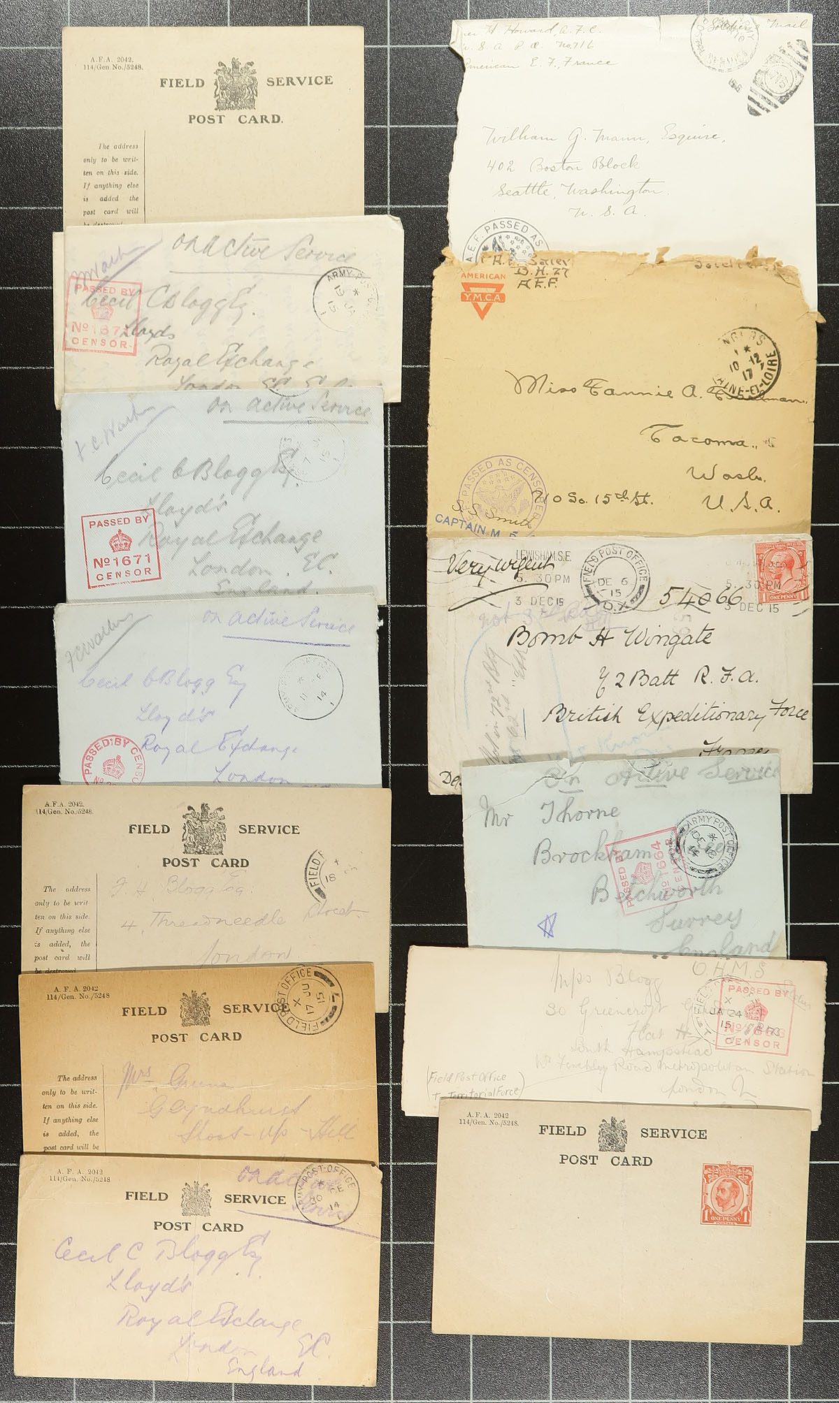 WWI Postal History. An interesting assembly of British (x37) and USA (x14) covers / postcards, largely from WWI forces in France. A nice variety of censor and Field Post Office markings, with most be easily read (these were notorious for poor cancellation strikes). A few highlights include a cover to the Postal Corps B.E.F. (British Expeditionary Forces) in France, a note from the Postal Censor explaining why a postcard was refused, an illustrated Cigarette "thanks" postcard and a registered cover to the Egyptian Expeditionary Forces (returned to sender). Several of the covers have the original letters enclosed. A total of 51 items. Estimate =