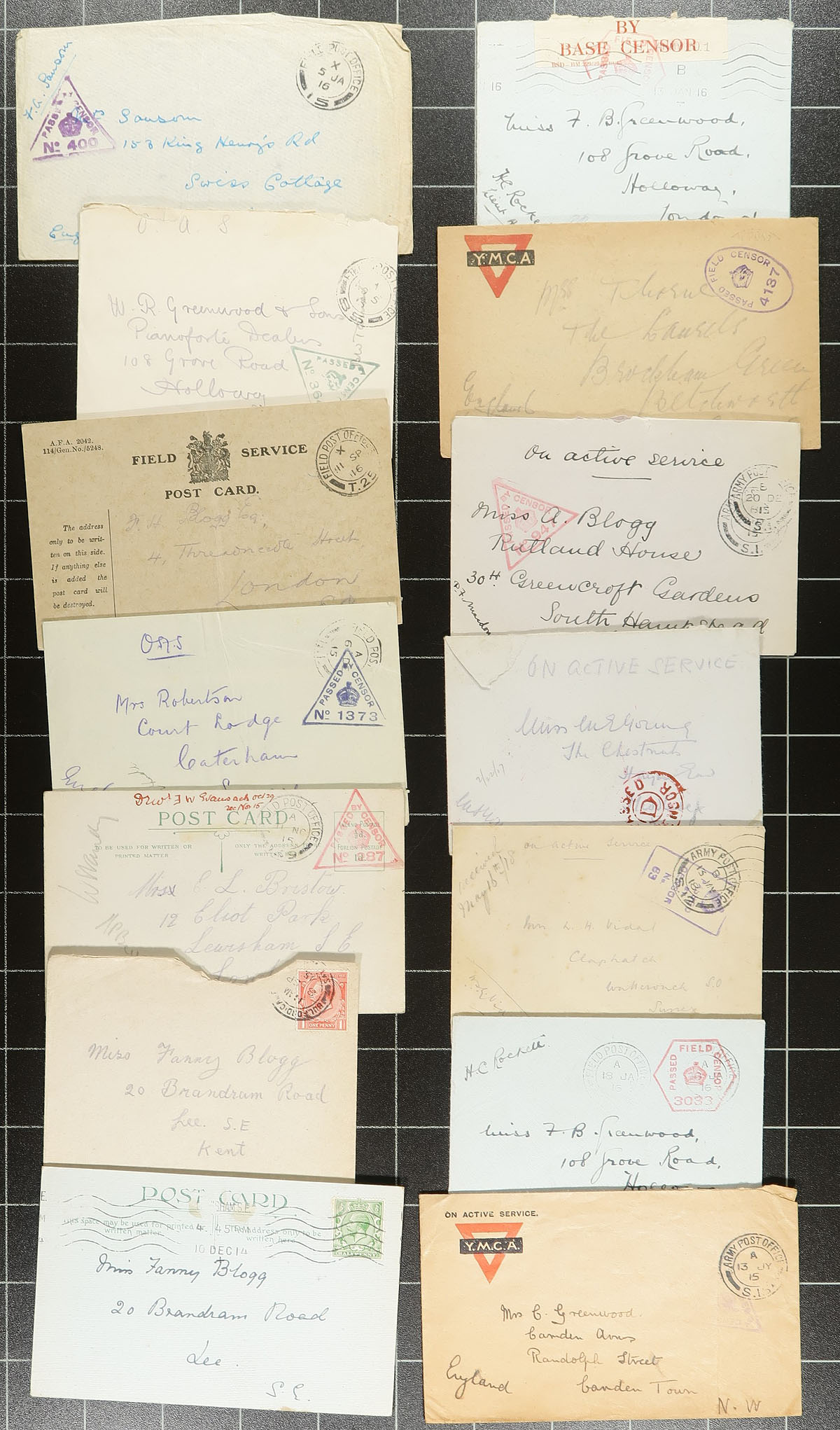 WWI Postal History. An interesting assembly of British (x37) and USA (x14) covers / postcards, largely from WWI forces in France. A nice variety of censor and Field Post Office markings, with most be easily read (these were notorious for poor cancellation strikes). A few highlights include a cover to the Postal Corps B.E.F. (British Expeditionary Forces) in France, a note from the Postal Censor explaining why a postcard was refused, an illustrated Cigarette "thanks" postcard and a registered cover to the Egyptian Expeditionary Forces (returned to sender). Several of the covers have the original letters enclosed. A total of 51 items. Estimate =
