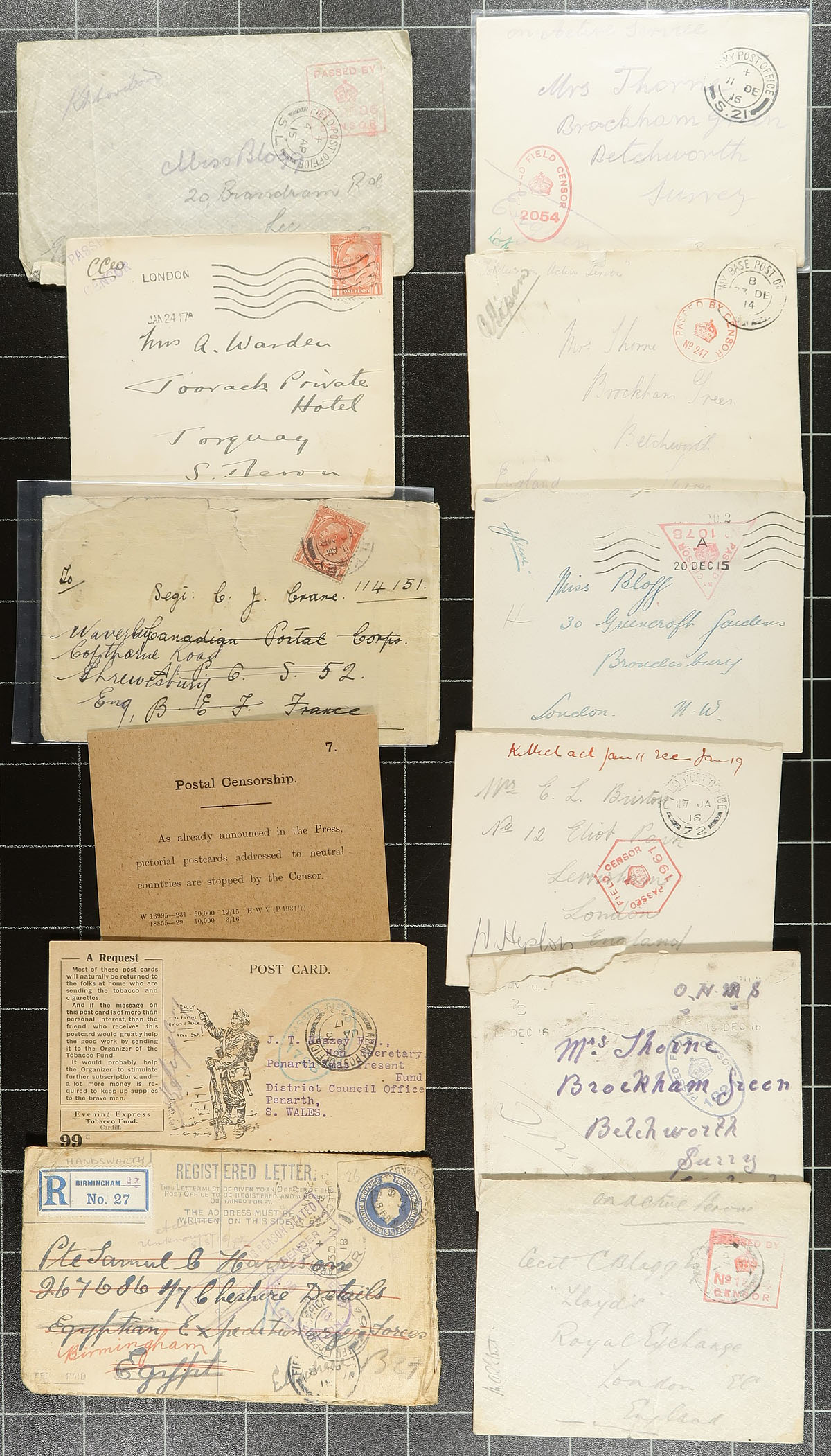 WWI Postal History. An interesting assembly of British (x37) and USA (x14) covers / postcards, largely from WWI forces in France. A nice variety of censor and Field Post Office markings, with most be easily read (these were notorious for poor cancellation strikes). A few highlights include a cover to the Postal Corps B.E.F. (British Expeditionary Forces) in France, a note from the Postal Censor explaining why a postcard was refused, an illustrated Cigarette "thanks" postcard and a registered cover to the Egyptian Expeditionary Forces (returned to sender). Several of the covers have the original letters enclosed. A total of 51 items. Estimate =