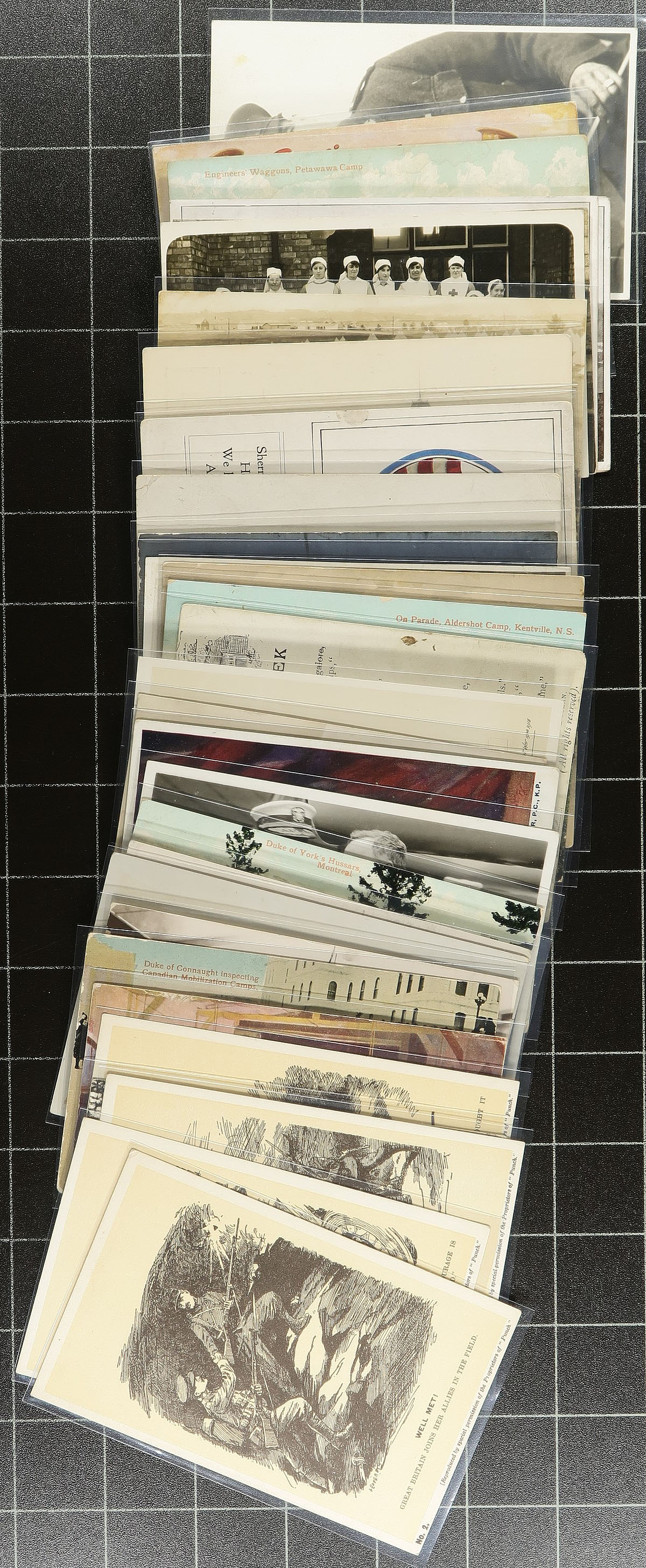 Military Themed Collection. An interesting array of 36 postcards with a "Military" theme. This theme is somewhat open-ended and includes scenes that include Patriotic, scenes from the trenches, soldiers in uniform, military camps, battle scenes etc. Primarily WWI era, with British and Canadian being the predominant types. A wonderful opportunity to acquire a large group of these at once. Perfect for the collector or dealer and many of these cards would retail in the $10-$20 range. Estimate =