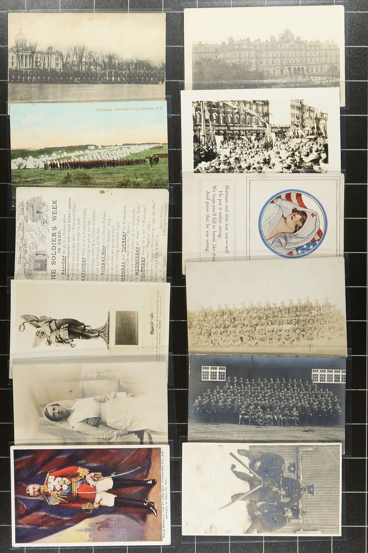 Military Themed Collection. An interesting array of 36 postcards with a "Military" theme. This theme is somewhat open-ended and includes scenes that include Patriotic, scenes from the trenches, soldiers in uniform, military camps, battle scenes etc. Primarily WWI era, with British and Canadian being the predominant types. A wonderful opportunity to acquire a large group of these at once. Perfect for the collector or dealer and many of these cards would retail in the $10-$20 range. Estimate =