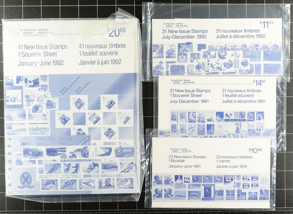 Post Office Bi-Annual Packs. A near complete run of the 1985-1992 Canada Post sealed bi-annual stamp packages (the precursor of the "quarterly pack") covering the entire run of issues for the period. Two packages per year, near complete for the 8 year period, only missing the 1st pack of 1986. While mentioned in Unitrade, these have yet to be valued. We are seeing fewer of these sealed packages each year, as many were opened for use. Valued for the total postage value only, but certainly worth more. Total face value =