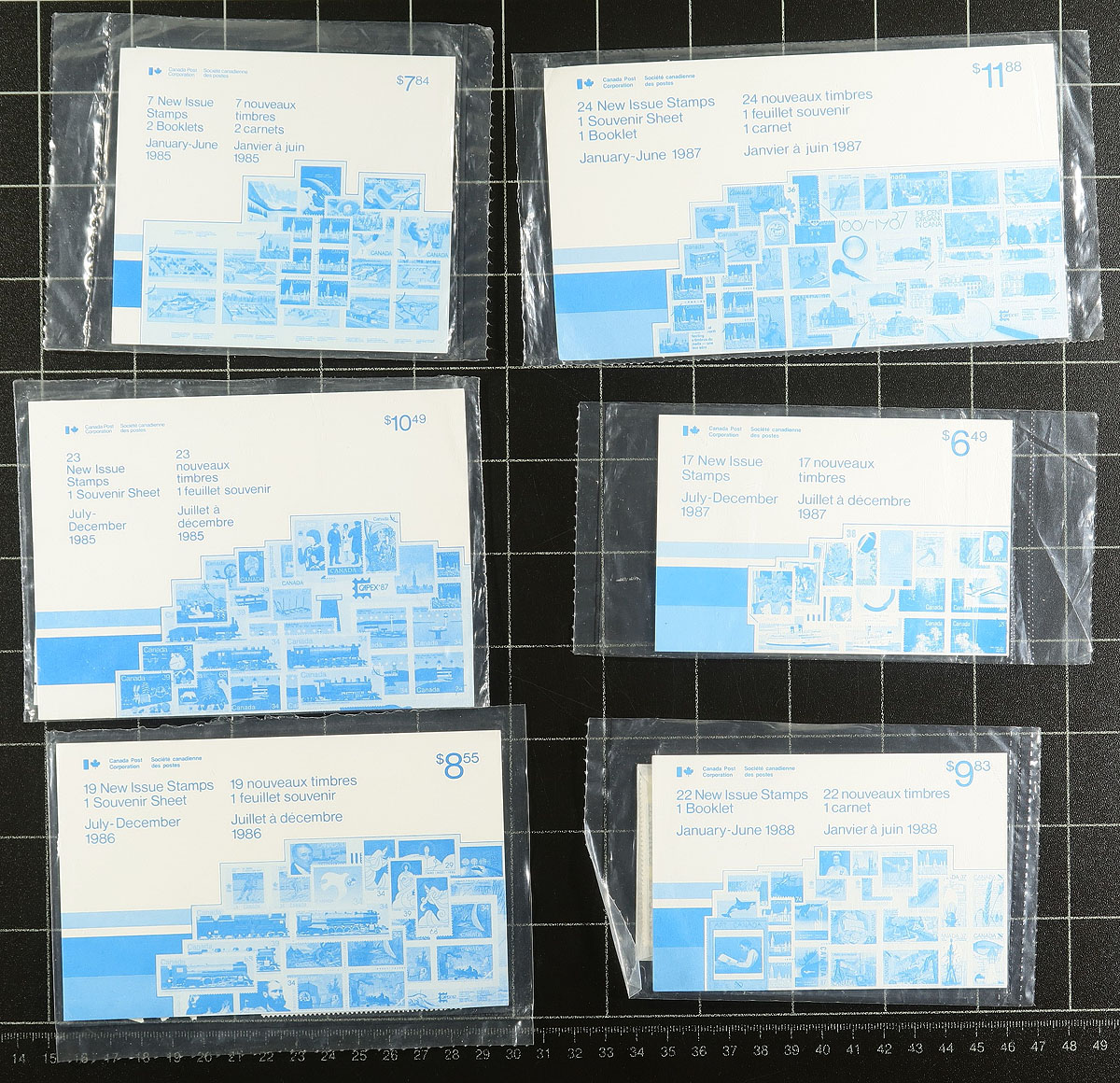 Post Office Bi-Annual Packs. A near complete run of the 1985-1992 Canada Post sealed bi-annual stamp packages (the precursor of the "quarterly pack") covering the entire run of issues for the period. Two packages per year, near complete for the 8 year period, only missing the 1st pack of 1986. While mentioned in Unitrade, these have yet to be valued. We are seeing fewer of these sealed packages each year, as many were opened for use. Valued for the total postage value only, but certainly worth more. Total face value =