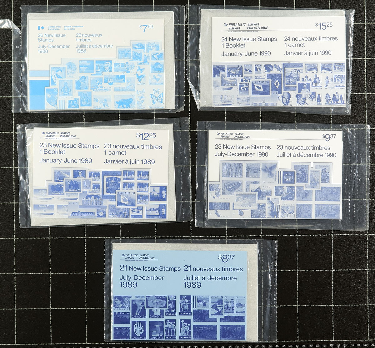 Post Office Bi-Annual Packs. A near complete run of the 1985-1992 Canada Post sealed bi-annual stamp packages (the precursor of the "quarterly pack") covering the entire run of issues for the period. Two packages per year, near complete for the 8 year period, only missing the 1st pack of 1986. While mentioned in Unitrade, these have yet to be valued. We are seeing fewer of these sealed packages each year, as many were opened for use. Valued for the total postage value only, but certainly worth more. Total face value =
