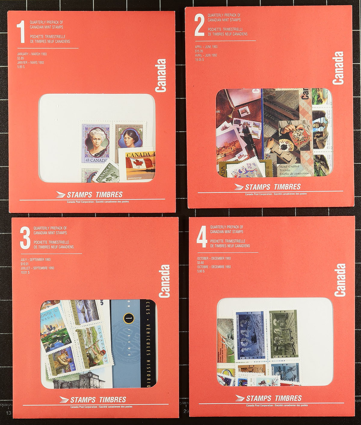 Post Office Quarterly Packs 1993/1994. Complete sealed run of all the quarterly packs for the 1993/1994 issues (8 packs in total). This was the first year of quarterly packs, issued in paper glassine packs, as opposed to the earlier versions in plastic, issued twice per year. These early quarterly packs are getting tough to find, and while listed in Unitrade, are not given a value. The total face value adds to $70.76, but certainly worth more. Estimate =