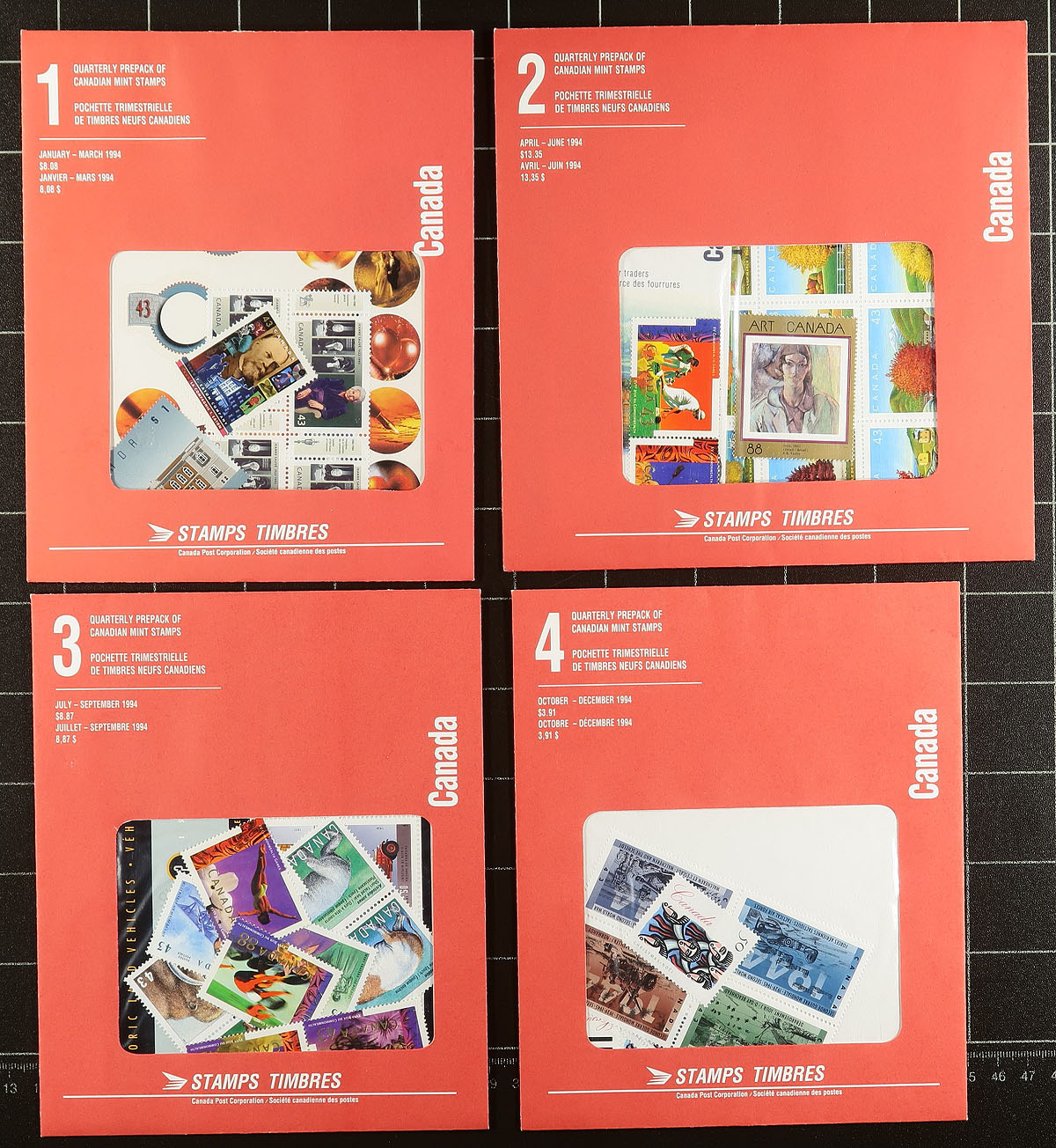 Post Office Quarterly Packs 1993/1994. Complete sealed run of all the quarterly packs for the 1993/1994 issues (8 packs in total). This was the first year of quarterly packs, issued in paper glassine packs, as opposed to the earlier versions in plastic, issued twice per year. These early quarterly packs are getting tough to find, and while listed in Unitrade, are not given a value. The total face value adds to $70.76, but certainly worth more. Estimate =