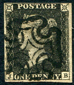 Three-margin "Penny Black" position "J-B with a "socked on the nose" black "Maltese Cross". A wonderfully sharp example of the world's best known stamp. Identified as Plate #5 by the previous owner. 2024 Scott US$375.00 =