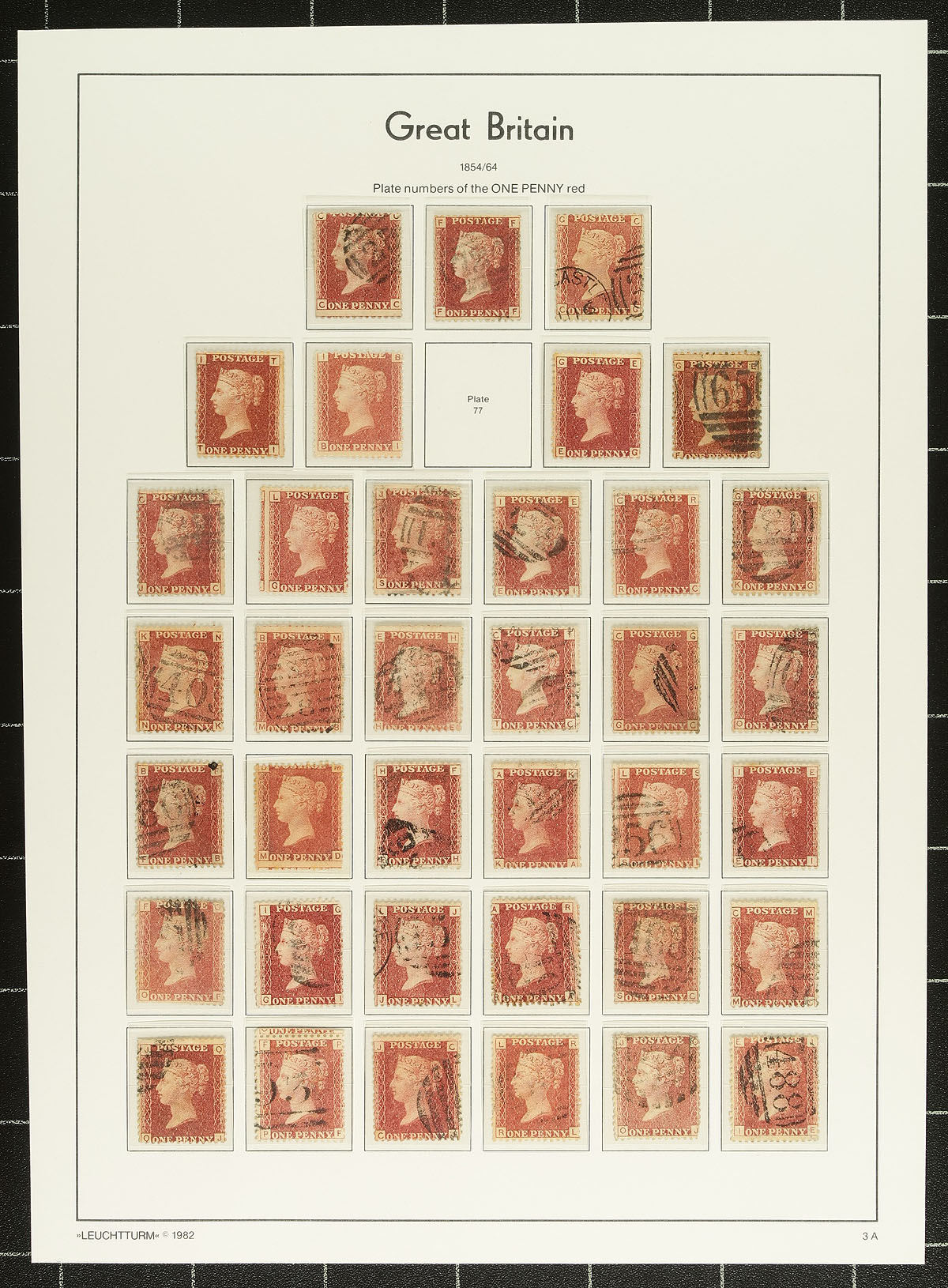 Plate Number Collection. A stunning collection of 1864-1879 issued Penny Reds, all laid and arranged by plate number, on Lighthouse hingeless pages. A near complete run, missing only the elusive Plates #77 and 225. The condition seems well above average, but expect the odd minor fault (but also noted a few mint examples, and several nice postmarks). A great opportunity to acquire this run of plates, which can take considerable time to assemble. Estimate =