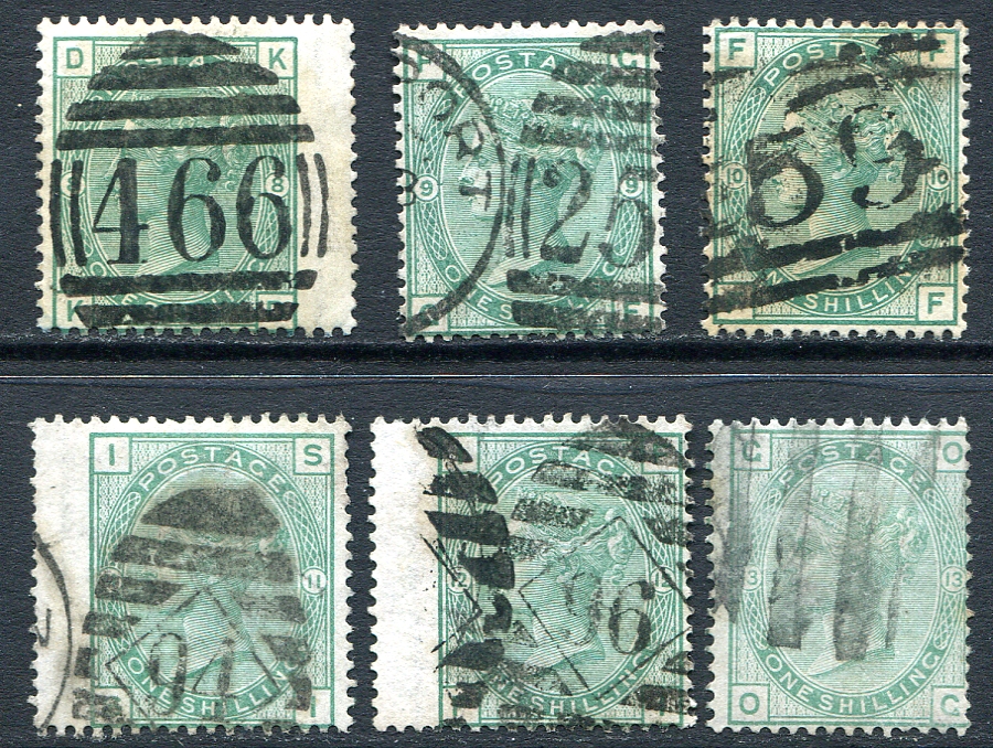 Fine used near complete run of Plates Numbers 8-13 inclusive, (naturally, missing the exceedingly rare plate #14) of the 1873-1880 issue 1sh pale / deep green Queen Victoria series. Some nice postmarks and wing-margin examples noted. 2024 Scott Classic US$1315.00 =