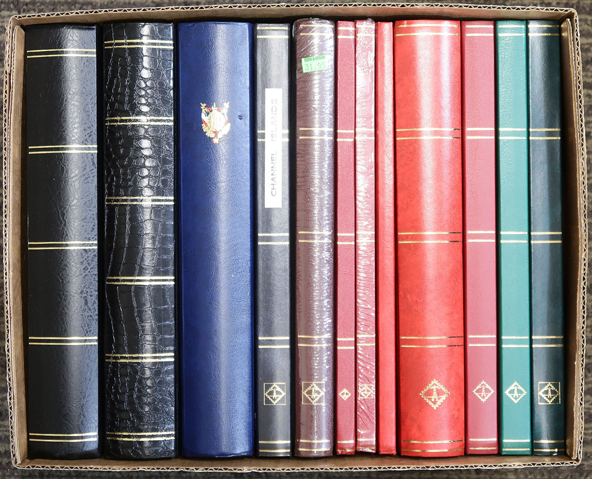 Stockbooks. Group of 12 gently used, about half are Lighthouse brand, in a range of 16-64 page configurations, and in a variety of black/white pages (three of the Lighthouse brand 32-page examples are black pages). Included is a wonderful 64-page "France" specialized illustrated cover stockbook. A nice clean lot, most "like new" and even one "new", still in the plastic wrap. Nice to get these outside retail, at a fraction of the "new" cost. Estimate =