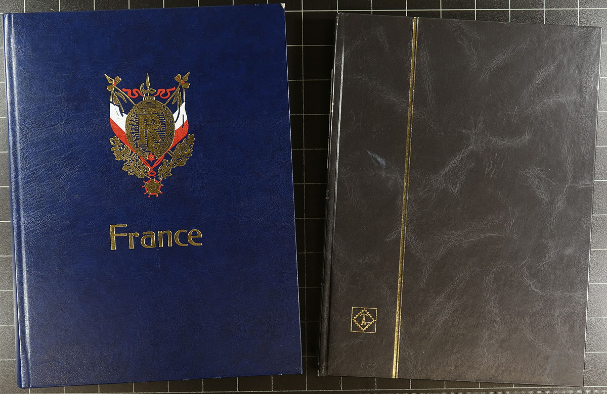 Stockbooks. Group of 12 gently used, about half are Lighthouse brand, in a range of 16-64 page configurations, and in a variety of black/white pages (three of the Lighthouse brand 32-page examples are black pages). Included is a wonderful 64-page "France" specialized illustrated cover stockbook. A nice clean lot, most "like new" and even one "new", still in the plastic wrap. Nice to get these outside retail, at a fraction of the "new" cost. Estimate =