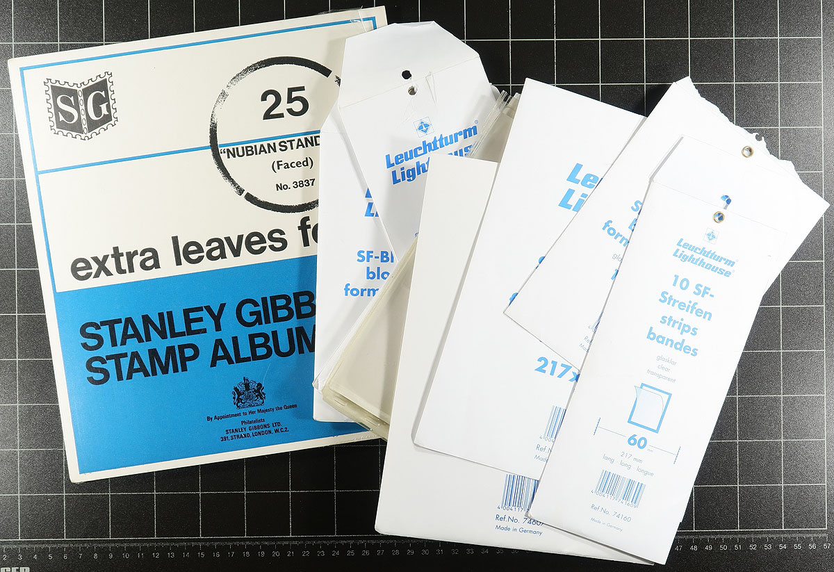 Estate Bankers Box Offering #1. Group of gently used (or unused) group of philatelic supplies, as part of a local estate offering. This box includes (in no particular order). 1) Two Unisafe brand FDC albums. 2) Unused Minkus brand "Canada and Provinces" album, with pages to 1967 (nice to set a limit to 100 years of Confederation!). 3) Binder with 27x like-new manila stocksheets. 4) Brand new package of 100x heavy weight quadrille 3-ring hole punched pages. 5) Several packages of blank / hingeless pages for Lighthouse albums (some with Australia / Channel Islands headers. 6) About 10 partial packages of large-size Lighthouse clear mounts of various sizes. 7) Brand new package (25) of Stanley Gibbons black "Nubian Standard" pages. 8) Padded blue FDC album. 9) Five misc partial packages of stamp hinges (most near full). 10) Deluxe 3-ring album (Lighthouse style), but not marked. A nice diverse offering, which would add up significantly in original retail cost. Estimate =