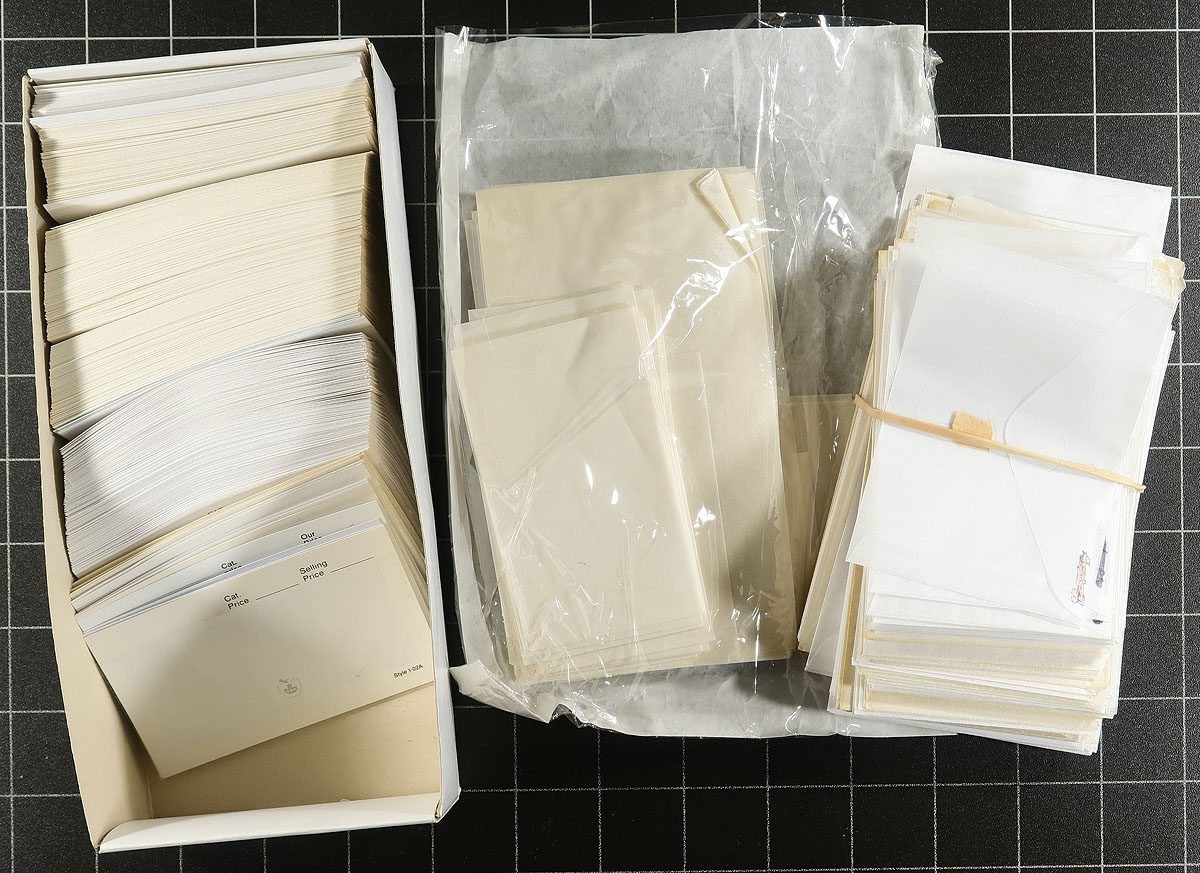 Estate Bankers Box Offering #2. Group of gently used (or unused) group of philatelic supplies, as part of a local estate offering. This box includes (in no particular order). 1) About 250x unused "102" cards in a box. 2) An old (likely at least 90 years old) Scott Stamp Co. springback album with blank quadrille pages (a bit of TLC needed, but a neat album). 3) Unisafe brand padded FDC albums x5 (including 2x for #10 size covers). 4) Two "stamp lift" boxes, with instructions, still in the original box (one needs a new sponge). 5) Two small format green FDC albums. 6) "The balance" large group of misc glassines, stockcards, stamp tongs, perf gauges, colour guides, mounts etc etc. A good value offering, with lots of life left! Estimate =