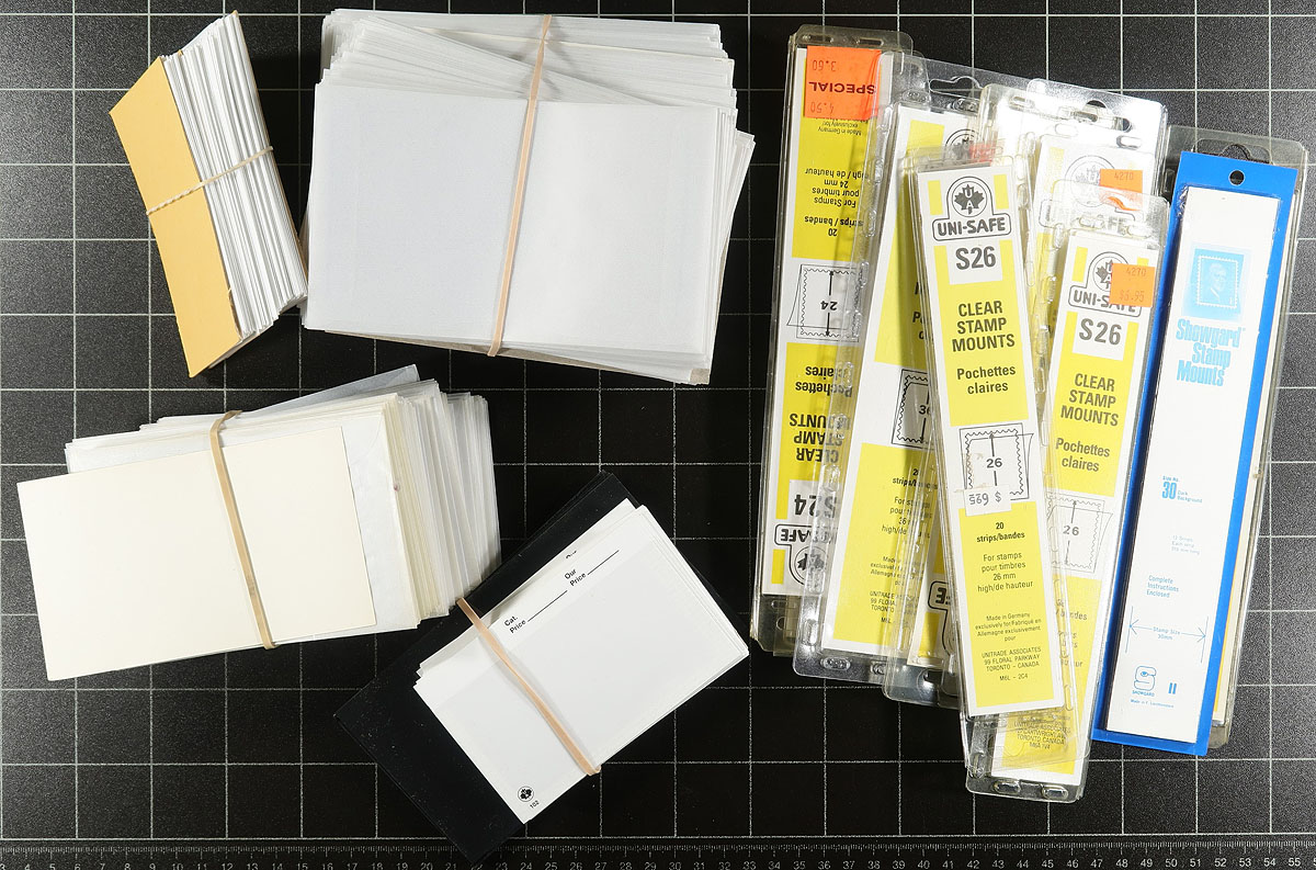 Estate Bankers Box Offering #2. Group of gently used (or unused) group of philatelic supplies, as part of a local estate offering. This box includes (in no particular order). 1) About 250x unused "102" cards in a box. 2) An old (likely at least 90 years old) Scott Stamp Co. springback album with blank quadrille pages (a bit of TLC needed, but a neat album). 3) Unisafe brand padded FDC albums x5 (including 2x for #10 size covers). 4) Two "stamp lift" boxes, with instructions, still in the original box (one needs a new sponge). 5) Two small format green FDC albums. 6) "The balance" large group of misc glassines, stockcards, stamp tongs, perf gauges, colour guides, mounts etc etc. A good value offering, with lots of life left! Estimate =