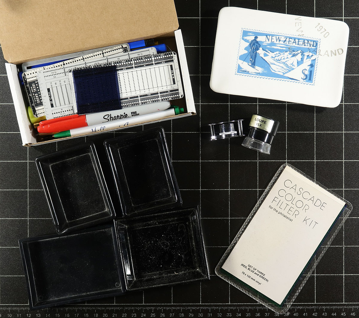 Estate Bankers Box Offering #2. Group of gently used (or unused) group of philatelic supplies, as part of a local estate offering. This box includes (in no particular order). 1) About 250x unused "102" cards in a box. 2) An old (likely at least 90 years old) Scott Stamp Co. springback album with blank quadrille pages (a bit of TLC needed, but a neat album). 3) Unisafe brand padded FDC albums x5 (including 2x for #10 size covers). 4) Two "stamp lift" boxes, with instructions, still in the original box (one needs a new sponge). 5) Two small format green FDC albums. 6) "The balance" large group of misc glassines, stockcards, stamp tongs, perf gauges, colour guides, mounts etc etc. A good value offering, with lots of life left! Estimate =