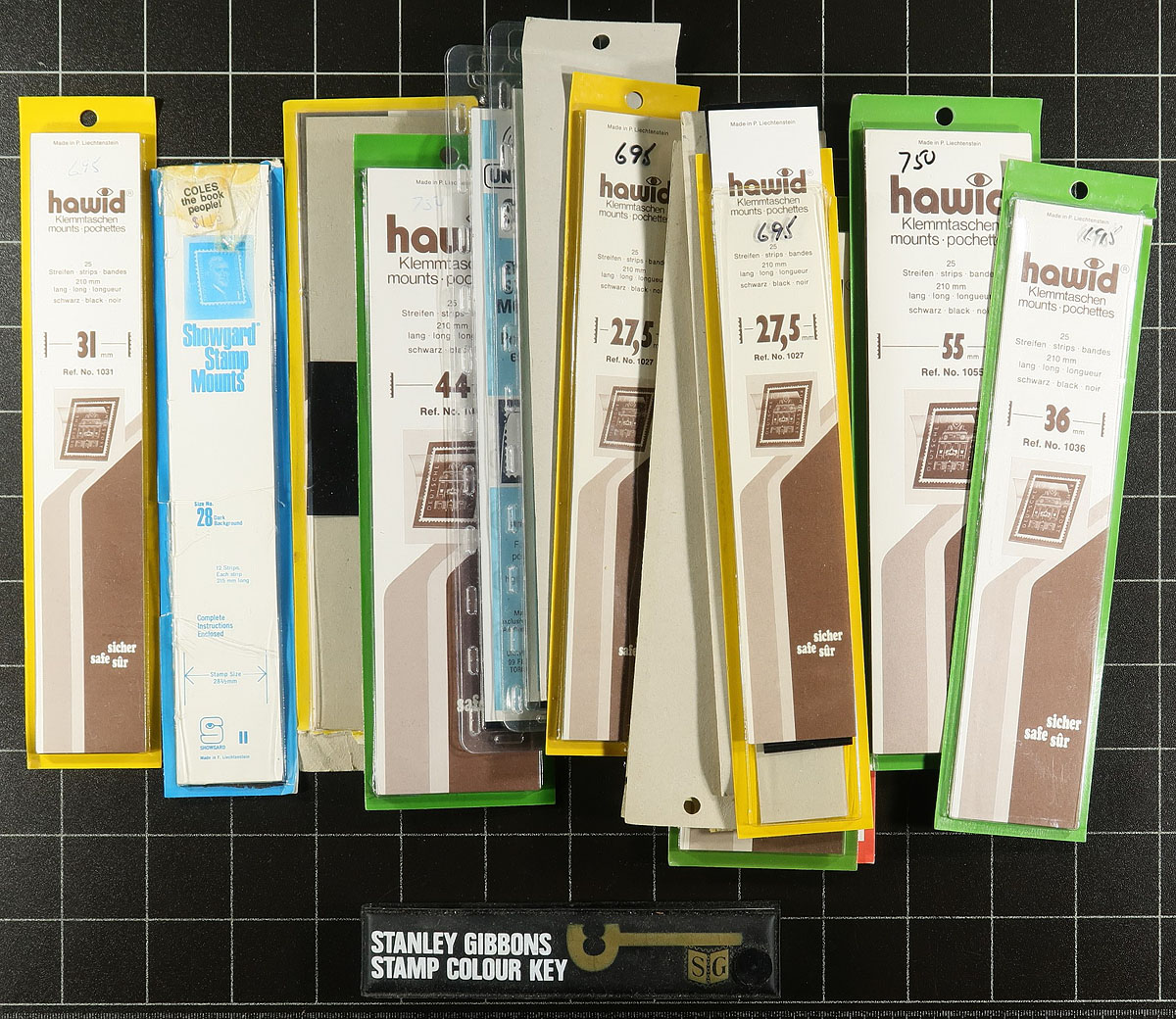 Estate Bankers Box Offering #3. Group of gently used (or unused) group of philatelic supplies, as part of a local estate offering. This box includes (in no particular order). 1) Two large "White Ace" hardcover mint sheet files (pages a bit yellow, but still functional). 2) Over 250x new quadrille heavy weight pages (3-hole punch). 3) Unisafe Postcard Album, with matching slipcase. 4) Older large format stockbook with black-pages. 5) Vario (or Vario style) stockpages x70 of various lines / configurations. 6) About 70x manila stockpasges, from unused, to well used with pencil markings. 7) "The balance" large group of misc mounts, loupes, stamp tongs, perf gauges, colour guides, stamp lift etc etc. Estimate =