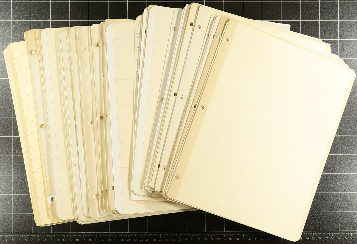 Estate Bankers Box Offering #3. Group of gently used (or unused) group of philatelic supplies, as part of a local estate offering. This box includes (in no particular order). 1) Two large "White Ace" hardcover mint sheet files (pages a bit yellow, but still functional). 2) Over 250x new quadrille heavy weight pages (3-hole punch). 3) Unisafe Postcard Album, with matching slipcase. 4) Older large format stockbook with black-pages. 5) Vario (or Vario style) stockpages x70 of various lines / configurations. 6) About 70x manila stockpasges, from unused, to well used with pencil markings. 7) "The balance" large group of misc mounts, loupes, stamp tongs, perf gauges, colour guides, stamp lift etc etc. Estimate =