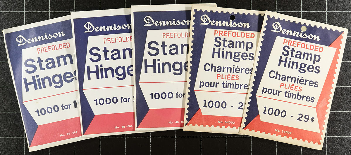 Dennison Hinge Goldmine. Lot of 5,000 "old school" Dennison hinges in five unopened packages. Includes hinges manufactured in both Framingham MA and Drummondville QC. These are the gold standard of hinges and haven't been manufactured for decades. Individual packs of Dennison's often sell for over $35.00 each on eBay. Estimate =