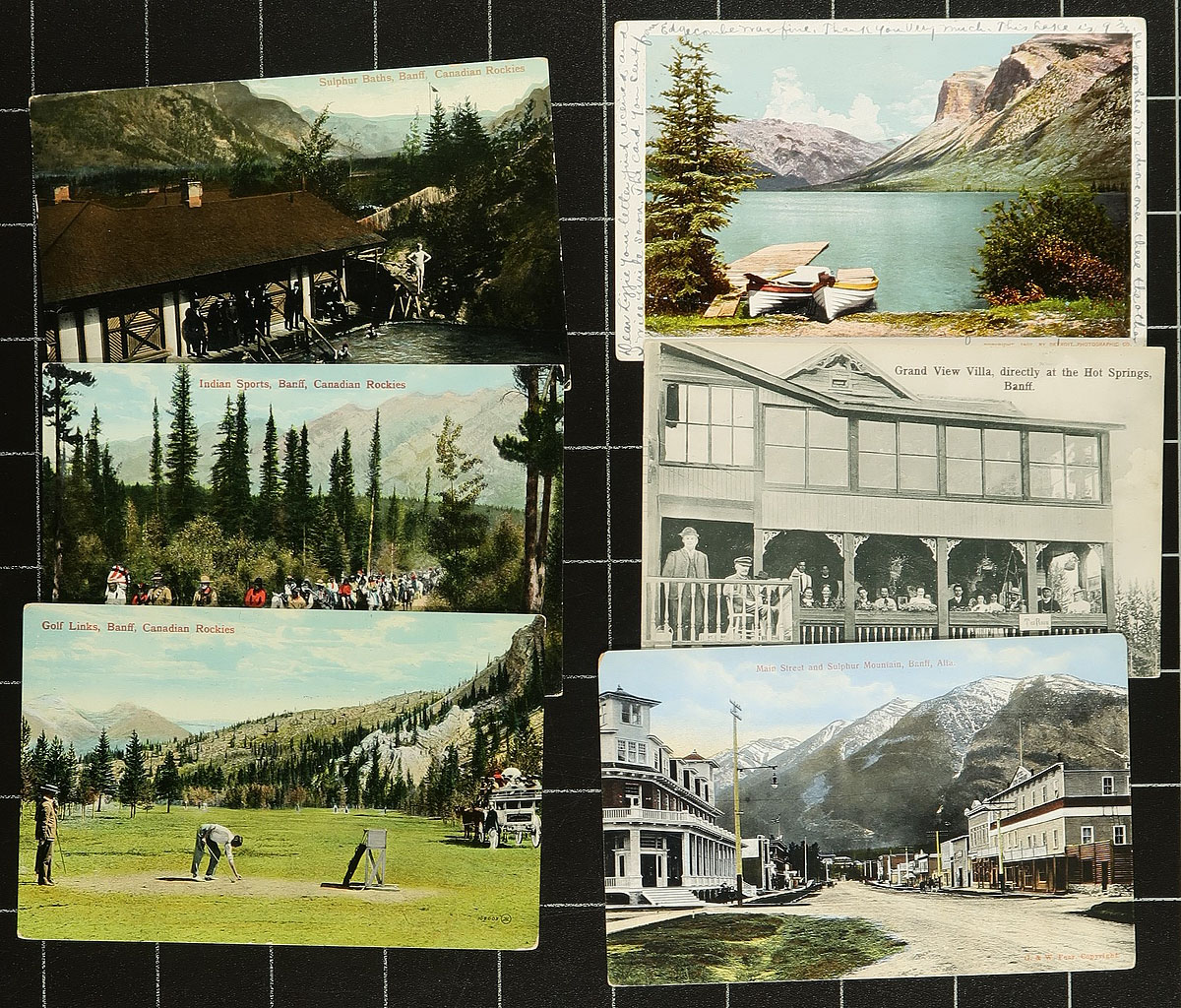Banff, Alberta. Specialized collector's holding of 136 postcards of Banff and surrounding area, mostly from the 1910-1940 period (with a few earlier / later). A good variety here, including both printed and Real Photo postcards, with scenes that include street views, Grand View Villa, Sulphur Mountain, the Sulphur Bath, Native Canadians and the Golf Course. A mix of both unused and used, with seemingly a bit more unused. A nice concentrated group, that would have taken years to assemble. Estimate =
