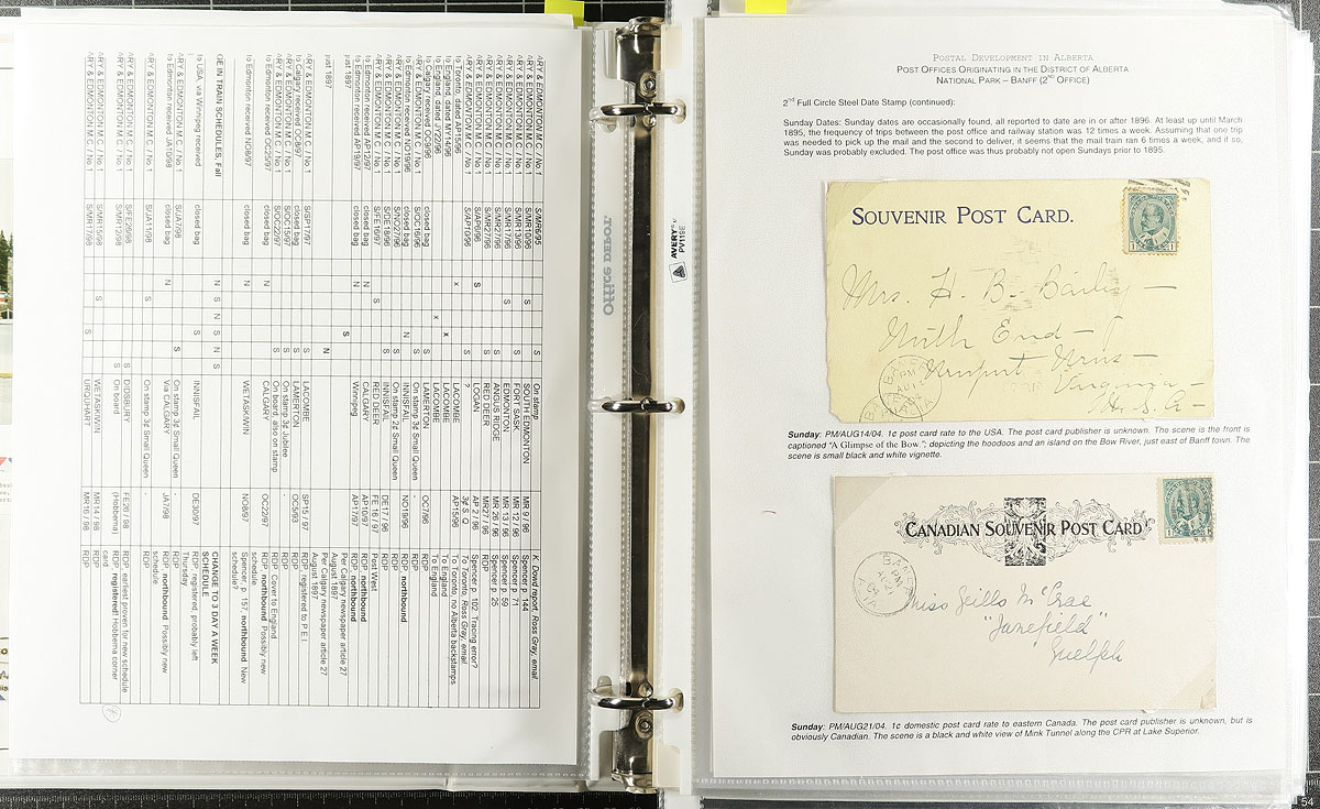 Banff, Alberta. Specialized Postal History Collection. A binder, comprising of well-written / described pages featuring 104 covers / postcards, plus several cancels on stamp/piece, all with Banff, Alberta postmarks. A nice range of material, starting in 1904/1905 during the Territorial period, followed by post-confederation duplex, CDS, general delivery, machine and slogan types. A wealth of knowledge here, with early and late dates often noted on the pages. Estimate =