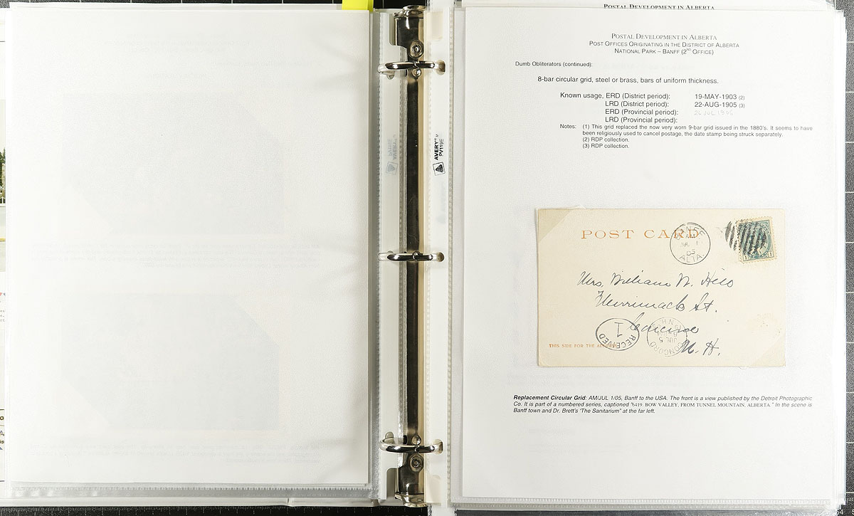 Banff, Alberta. Specialized Postal History Collection. A binder, comprising of well-written / described pages featuring 104 covers / postcards, plus several cancels on stamp/piece, all with Banff, Alberta postmarks. A nice range of material, starting in 1904/1905 during the Territorial period, followed by post-confederation duplex, CDS, general delivery, machine and slogan types. A wealth of knowledge here, with early and late dates often noted on the pages. Estimate =
