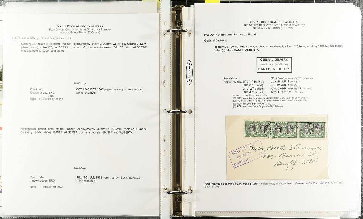 Banff, Alberta. Specialized Postal History Collection. A binder, comprising of well-written / described pages featuring 104 covers / postcards, plus several cancels on stamp/piece, all with Banff, Alberta postmarks. A nice range of material, starting in 1904/1905 during the Territorial period, followed by post-confederation duplex, CDS, general delivery, machine and slogan types. A wealth of knowledge here, with early and late dates often noted on the pages. Estimate =