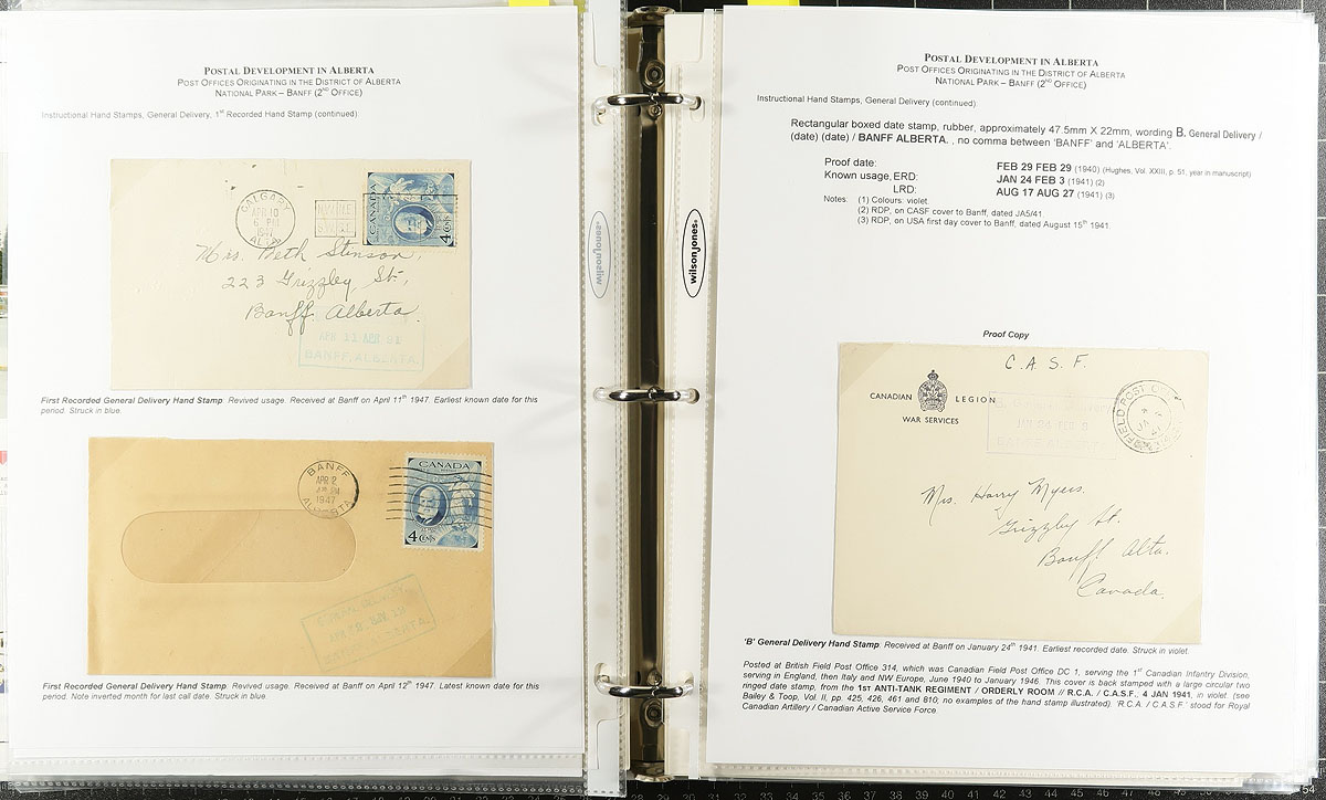 Banff, Alberta. Specialized Postal History Collection. A binder, comprising of well-written / described pages featuring 104 covers / postcards, plus several cancels on stamp/piece, all with Banff, Alberta postmarks. A nice range of material, starting in 1904/1905 during the Territorial period, followed by post-confederation duplex, CDS, general delivery, machine and slogan types. A wealth of knowledge here, with early and late dates often noted on the pages. Estimate =