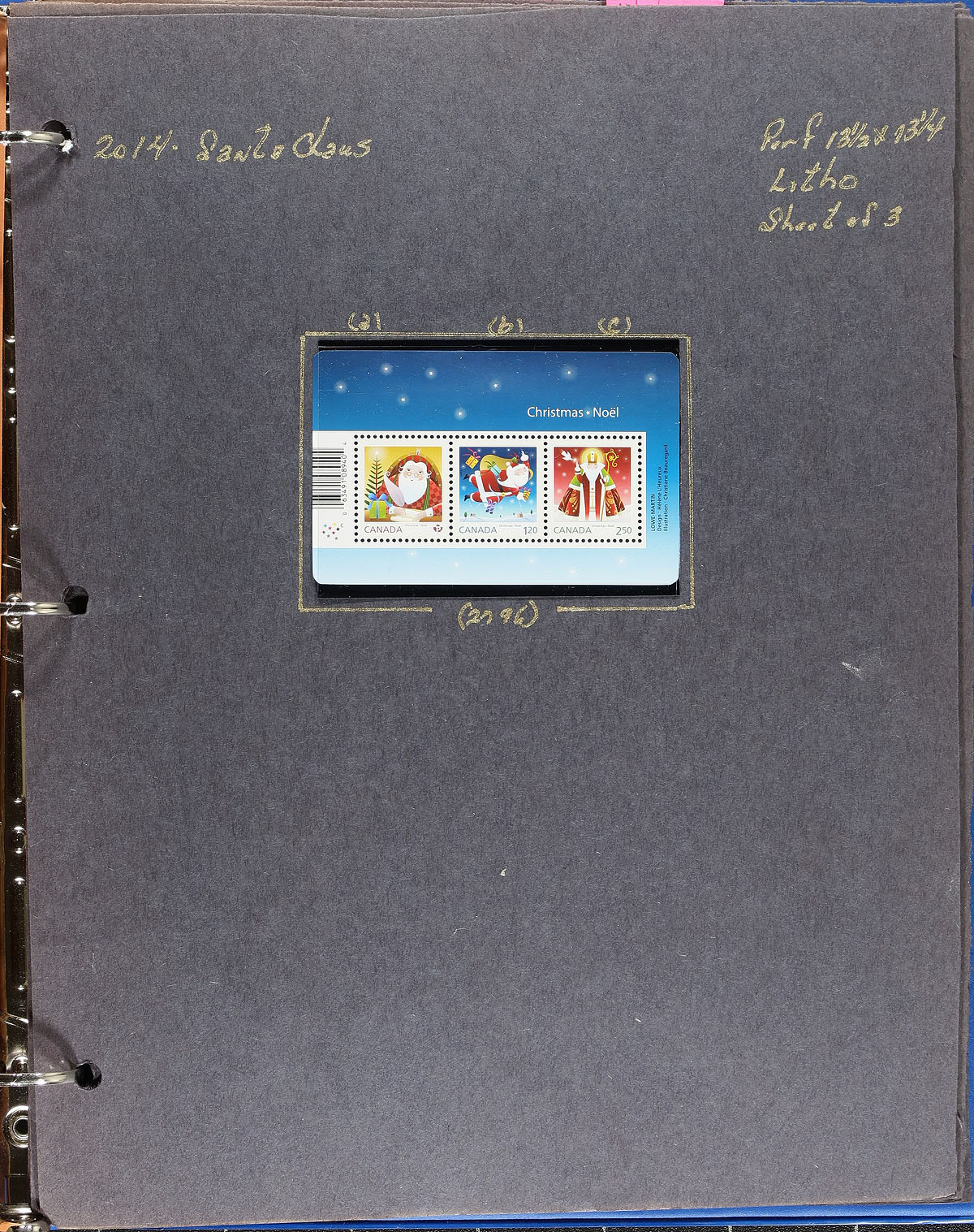 Lovely collection of primarily mint never hinged "Christmas" issues, October 2014, covering Unitrade #s 2796-2800, all in hingeless mounts in roughly 10 well described pages. The collection primarily contains complete booklets, part panes, mint and used booklet stamps, along with a few souvenir sheets and first day covers. Face value alone totals $158.00 (including 71x "P" stamps). A nice lot for all collectors. 2024 Unitrade =