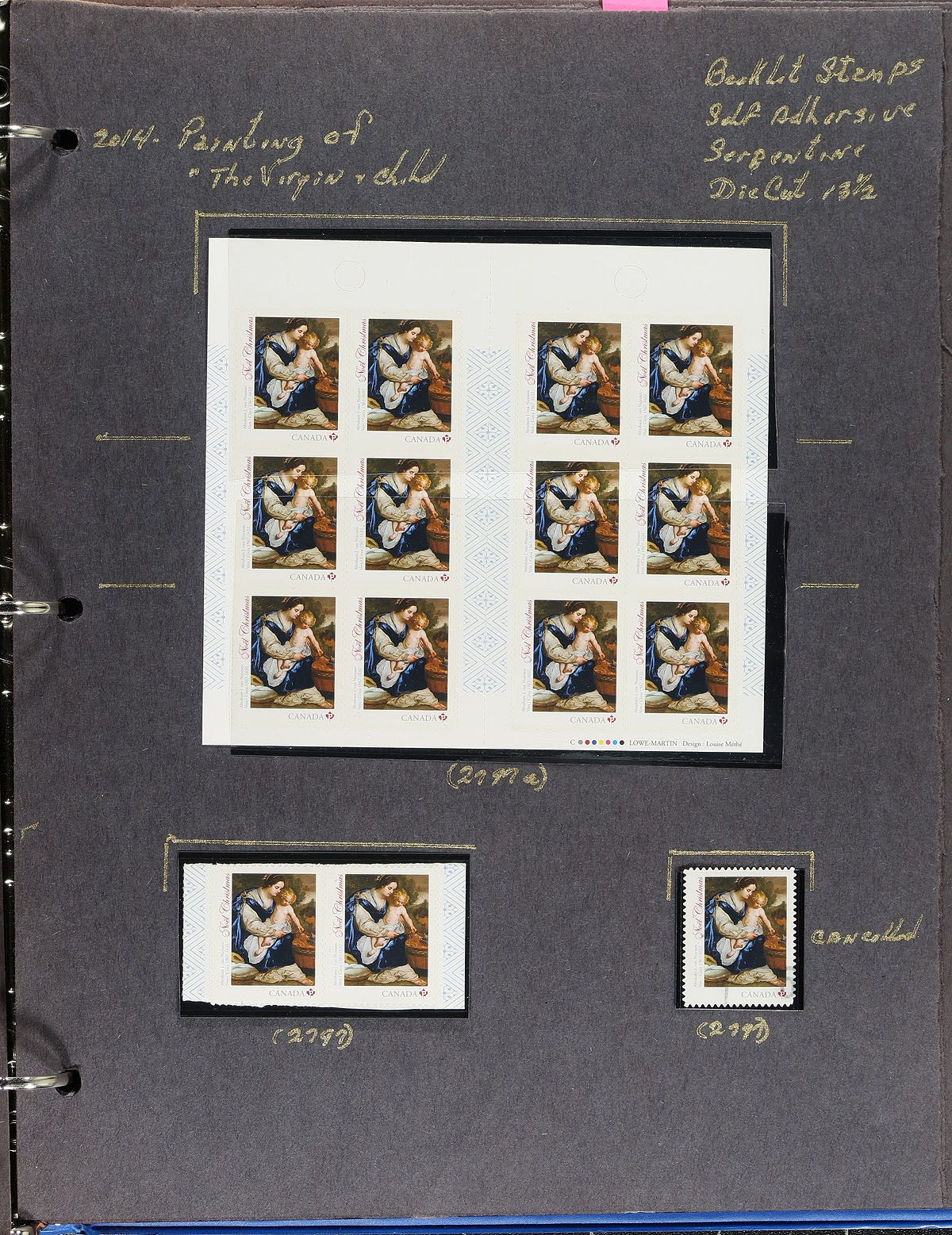 Lovely collection of primarily mint never hinged "Christmas" issues, October 2014, covering Unitrade #s 2796-2800, all in hingeless mounts in roughly 10 well described pages. The collection primarily contains complete booklets, part panes, mint and used booklet stamps, along with a few souvenir sheets and first day covers. Face value alone totals $158.00 (including 71x "P" stamps). A nice lot for all collectors. 2024 Unitrade =