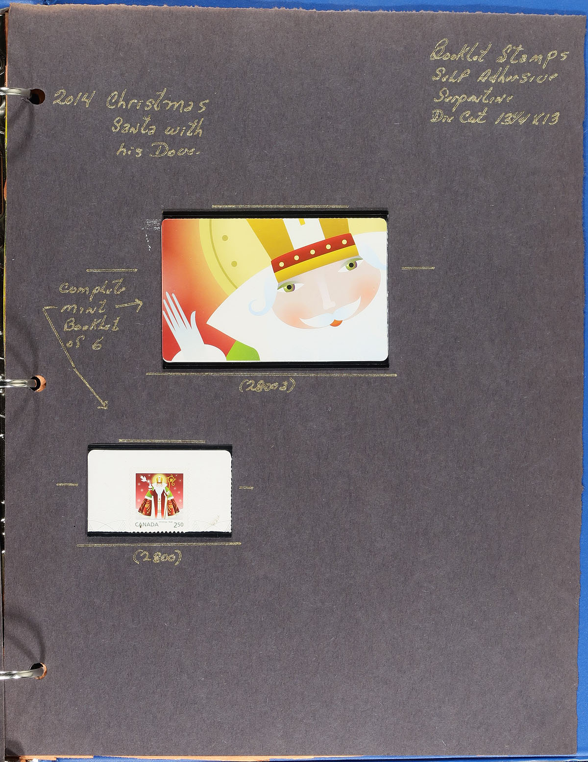 Lovely collection of primarily mint never hinged "Christmas" issues, October 2014, covering Unitrade #s 2796-2800, all in hingeless mounts in roughly 10 well described pages. The collection primarily contains complete booklets, part panes, mint and used booklet stamps, along with a few souvenir sheets and first day covers. Face value alone totals $158.00 (including 71x "P" stamps). A nice lot for all collectors. 2024 Unitrade =