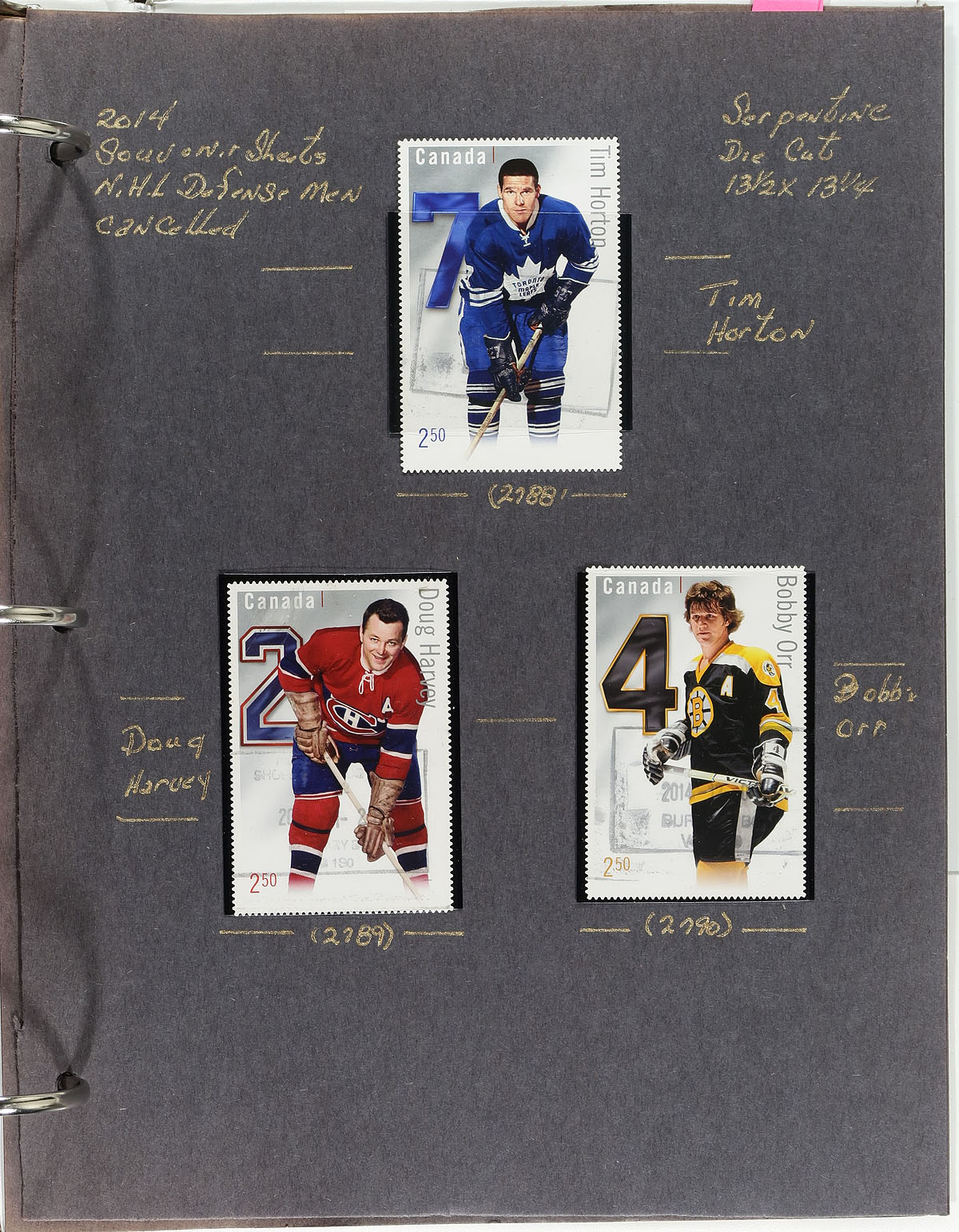 Lovely collection of primarily mint never hinged Canada, October 2014, covering Unitrade #s 2786-2795, all in hingeless mounts in roughly 10 well described pages. The collection contains mint and used stamps, complete booklets, mint and used booklet stamps, along with a few souvenir sheets and first day covers. We note a few items cataloguing $10 and up. Face value alone totals $90.00 (including 61x "P" stamps). A nice lot for all collectors. 2024 Unitrade =