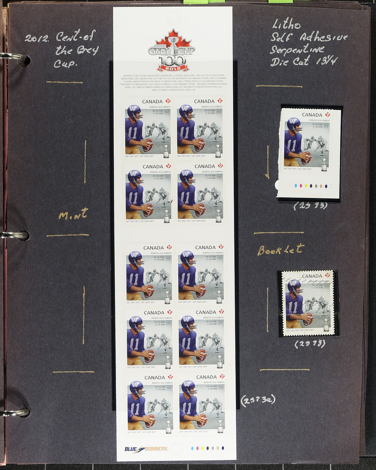 Lovely collection of primarily mint never hinged "100th Grey Cup Game" booklet issues, August 2012, covering Unitrade #s 2568-2576, all in hingeless mounts in roughly 30 well described pages housed in a binder. The collection contains 2 complete booklets for each issue, along with mint and used singles, and a few first day covers. We note a few items cataloguing $10 and up. Face value alone totals $322.00 (including 260x "P" stamps). A nice group for all collectors. 2024 Unitrade =