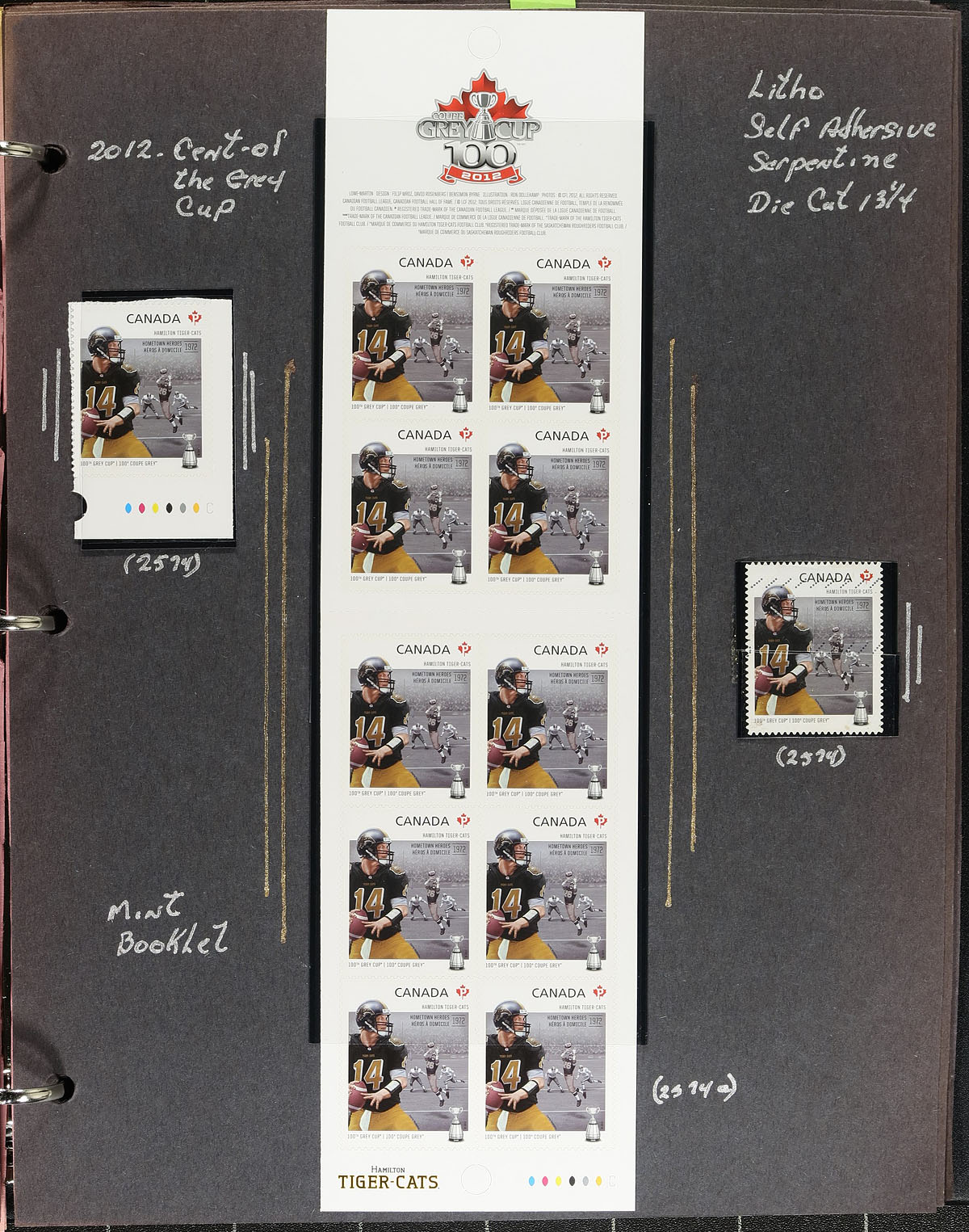 Lovely collection of primarily mint never hinged "100th Grey Cup Game" booklet issues, August 2012, covering Unitrade #s 2568-2576, all in hingeless mounts in roughly 30 well described pages housed in a binder. The collection contains 2 complete booklets for each issue, along with mint and used singles, and a few first day covers. We note a few items cataloguing $10 and up. Face value alone totals $322.00 (including 260x "P" stamps). A nice group for all collectors. 2024 Unitrade =