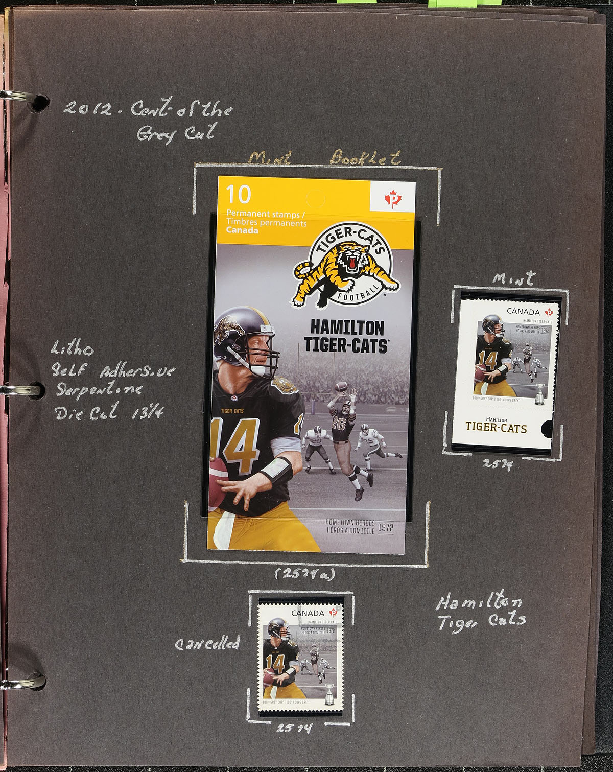 Lovely collection of primarily mint never hinged "100th Grey Cup Game" booklet issues, August 2012, covering Unitrade #s 2568-2576, all in hingeless mounts in roughly 30 well described pages housed in a binder. The collection contains 2 complete booklets for each issue, along with mint and used singles, and a few first day covers. We note a few items cataloguing $10 and up. Face value alone totals $322.00 (including 260x "P" stamps). A nice group for all collectors. 2024 Unitrade =
