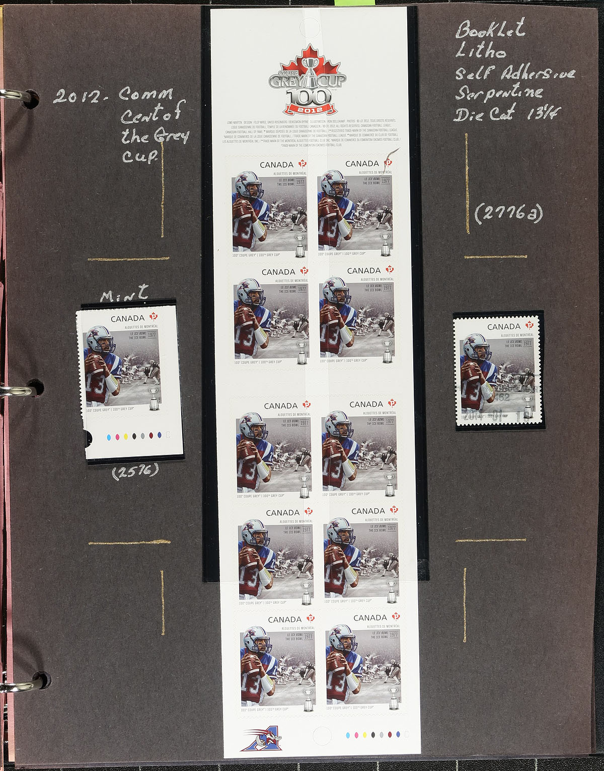 Lovely collection of primarily mint never hinged "100th Grey Cup Game" booklet issues, August 2012, covering Unitrade #s 2568-2576, all in hingeless mounts in roughly 30 well described pages housed in a binder. The collection contains 2 complete booklets for each issue, along with mint and used singles, and a few first day covers. We note a few items cataloguing $10 and up. Face value alone totals $322.00 (including 260x "P" stamps). A nice group for all collectors. 2024 Unitrade =