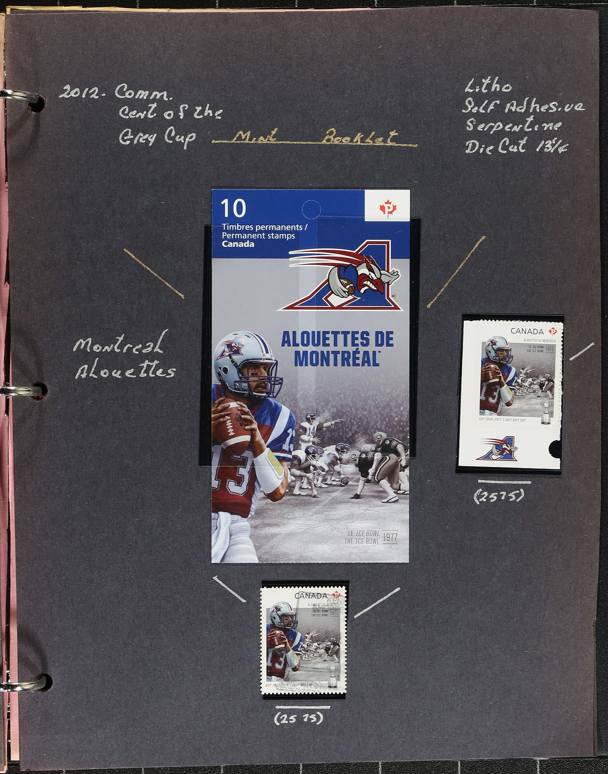 Lovely collection of primarily mint never hinged "100th Grey Cup Game" booklet issues, August 2012, covering Unitrade #s 2568-2576, all in hingeless mounts in roughly 30 well described pages housed in a binder. The collection contains 2 complete booklets for each issue, along with mint and used singles, and a few first day covers. We note a few items cataloguing $10 and up. Face value alone totals $322.00 (including 260x "P" stamps). A nice group for all collectors. 2024 Unitrade =