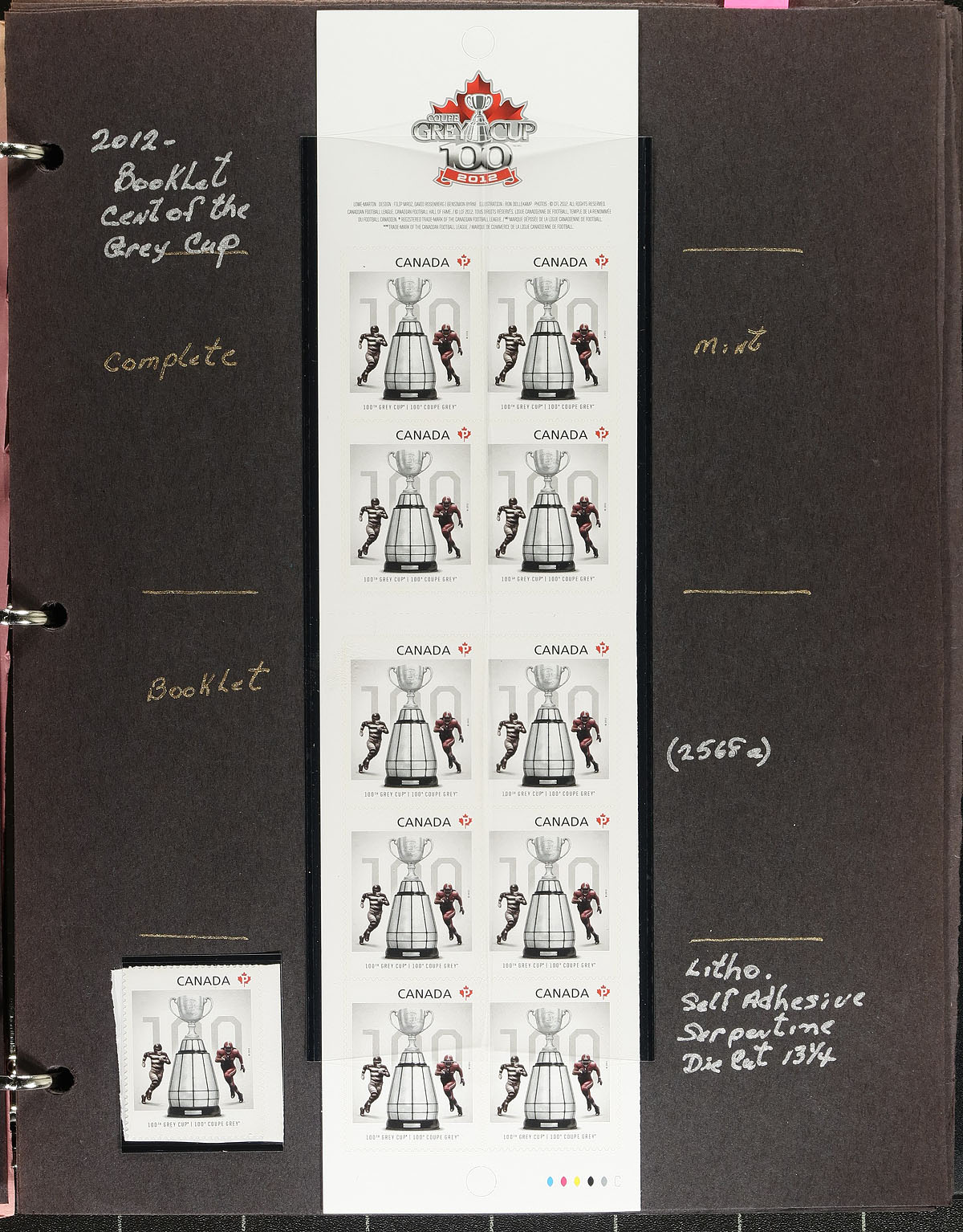 Lovely collection of primarily mint never hinged "100th Grey Cup Game" booklet issues, August 2012, covering Unitrade #s 2568-2576, all in hingeless mounts in roughly 30 well described pages housed in a binder. The collection contains 2 complete booklets for each issue, along with mint and used singles, and a few first day covers. We note a few items cataloguing $10 and up. Face value alone totals $322.00 (including 260x "P" stamps). A nice group for all collectors. 2024 Unitrade =
