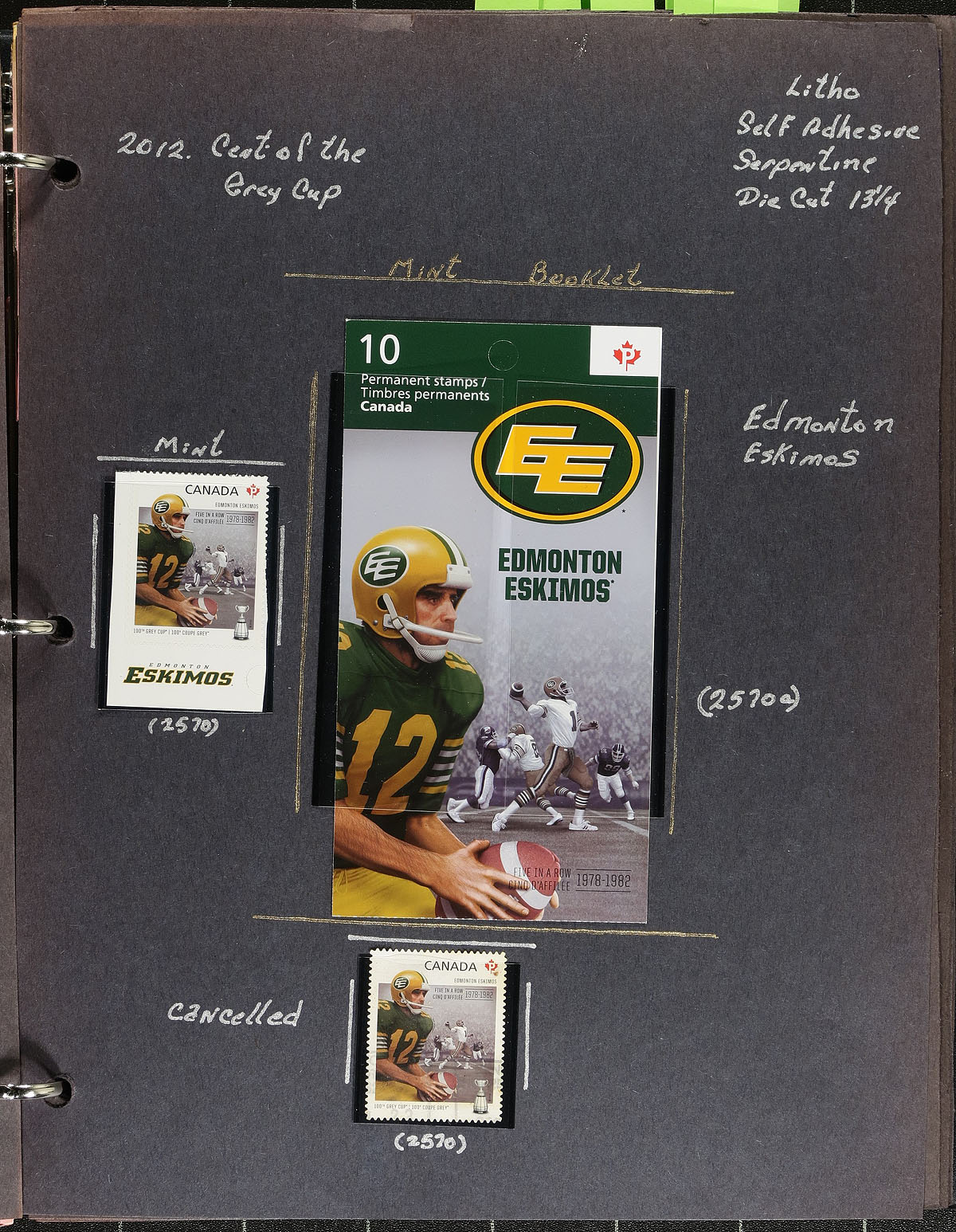 Lovely collection of primarily mint never hinged "100th Grey Cup Game" booklet issues, August 2012, covering Unitrade #s 2568-2576, all in hingeless mounts in roughly 30 well described pages housed in a binder. The collection contains 2 complete booklets for each issue, along with mint and used singles, and a few first day covers. We note a few items cataloguing $10 and up. Face value alone totals $322.00 (including 260x "P" stamps). A nice group for all collectors. 2024 Unitrade =