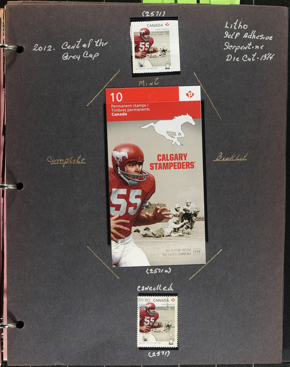 Lovely collection of primarily mint never hinged "100th Grey Cup Game" booklet issues, August 2012, covering Unitrade #s 2568-2576, all in hingeless mounts in roughly 30 well described pages housed in a binder. The collection contains 2 complete booklets for each issue, along with mint and used singles, and a few first day covers. We note a few items cataloguing $10 and up. Face value alone totals $322.00 (including 260x "P" stamps). A nice group for all collectors. 2024 Unitrade =