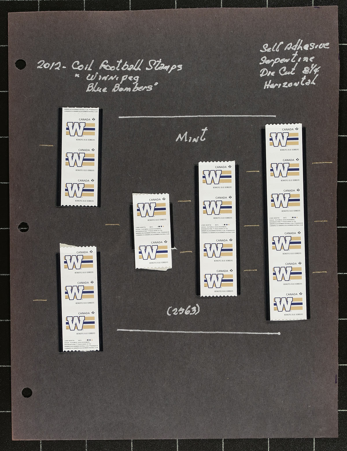Valuable collection of mint never hinged "CFL Teams", June 2012, covering Unitrade #s 2558-2566, all in hingeless mounts in roughly 30 well described pages. The collection contains primarily coil singles, pairs, and strips (typically up to 30 and more stamps per issue), along with a few souvenir sheets. Face value alone totals an impressive $507.00 (including 409x "P" stamps). A lovely lot with multiple purposes. 2024 Unitrade =