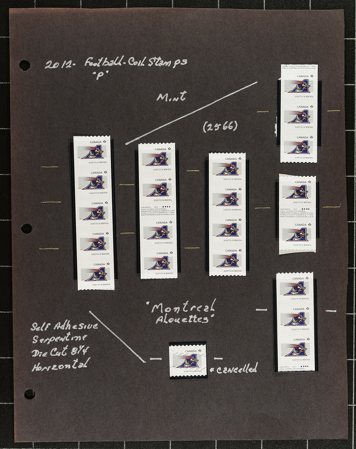 Valuable collection of mint never hinged "CFL Teams", June 2012, covering Unitrade #s 2558-2566, all in hingeless mounts in roughly 30 well described pages. The collection contains primarily coil singles, pairs, and strips (typically up to 30 and more stamps per issue), along with a few souvenir sheets. Face value alone totals an impressive $507.00 (including 409x "P" stamps). A lovely lot with multiple purposes. 2024 Unitrade =